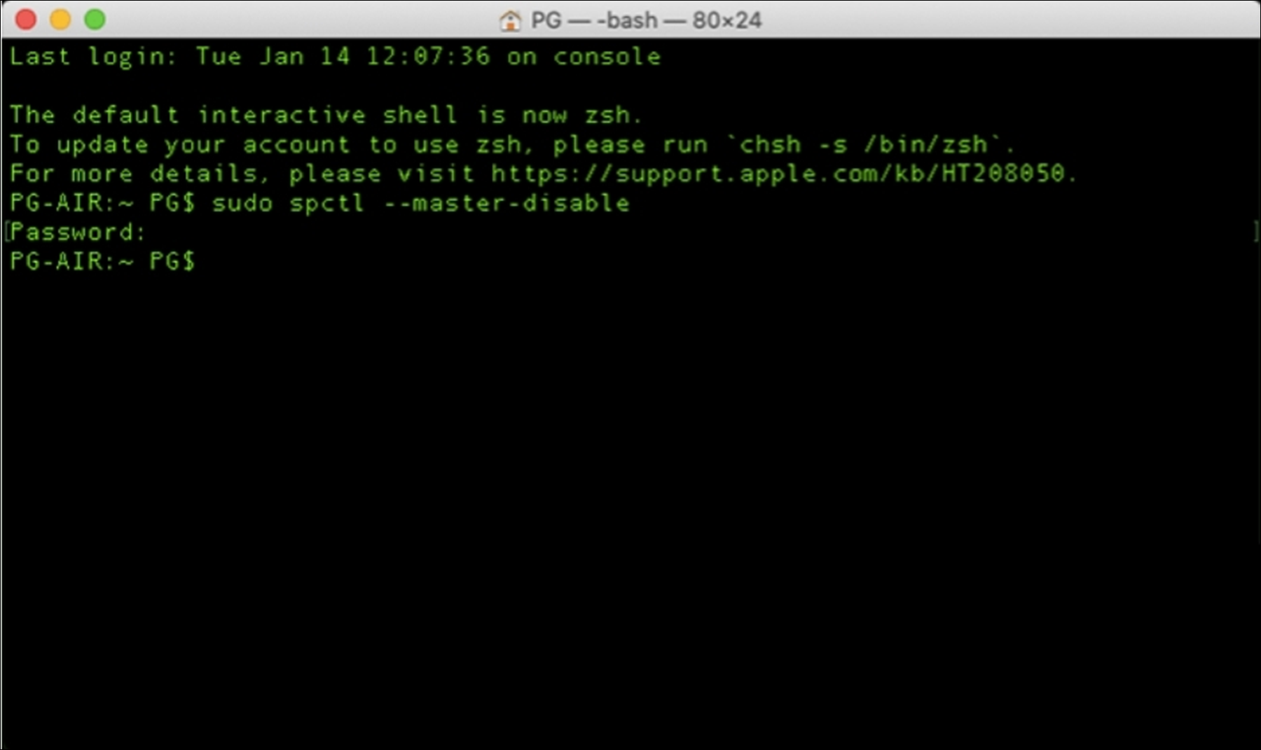 sudo spctl --master-disable 명령어로 게이트키퍼 비활성화가 가능합니다.