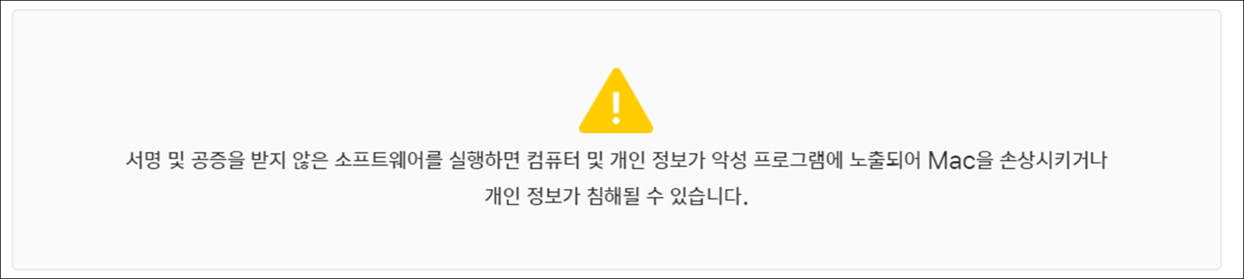 | 서명 및 공증을 받지 않은 소프트웨어를 실행하면 컴퓨터 및 개인 정보가 악성 프로그램에 노출되어 Mac을 손상시키거나 개인 정보가 침해 될 수 있습니다. |