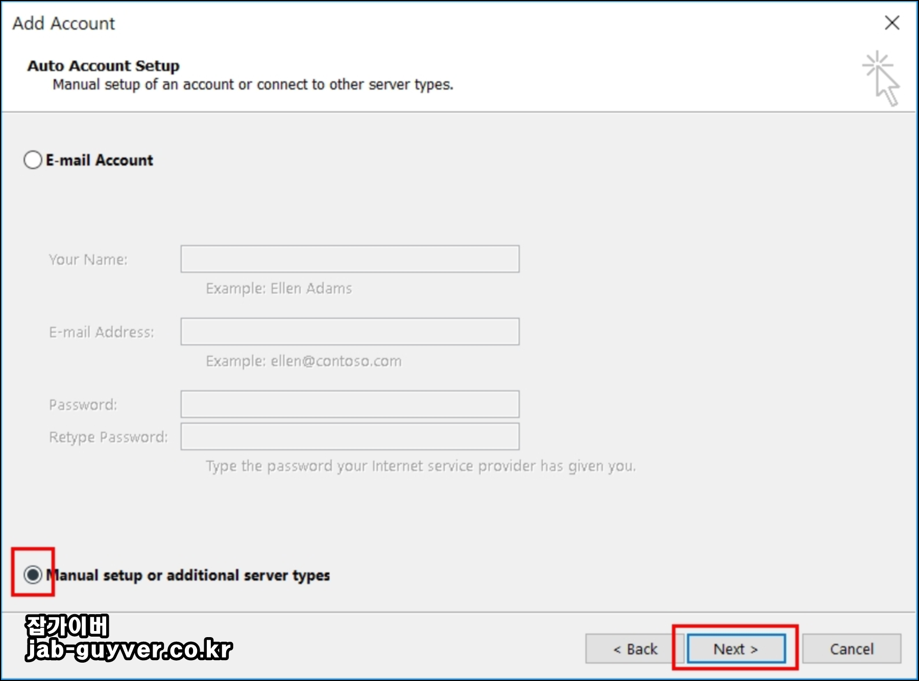 - 자동 설정 화면이 뜨면 Manual setup or additional server types 항목을 선택합니다.