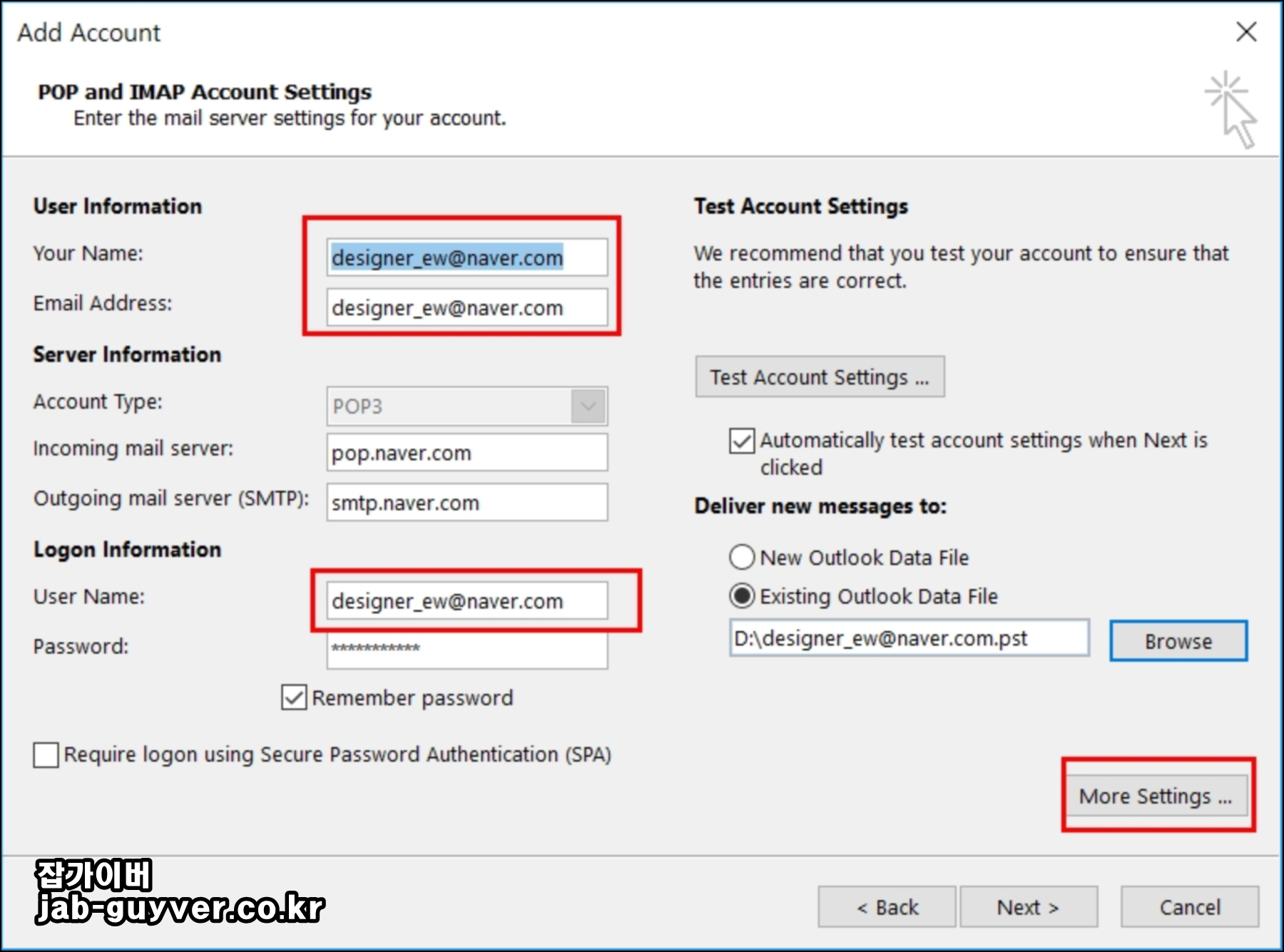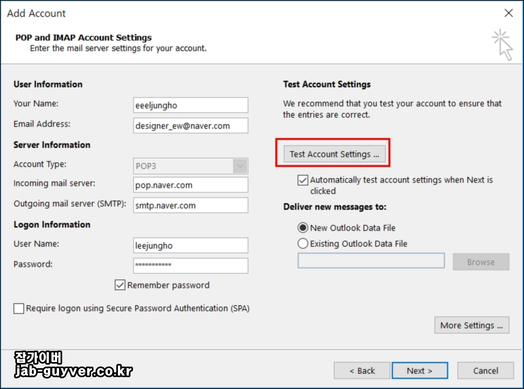 아웃룩 네이버 메일 서버값 입력 (POP3)