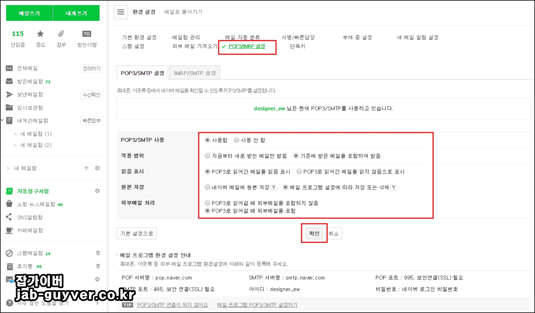 - 받는 메일 서버(POP3) : 995