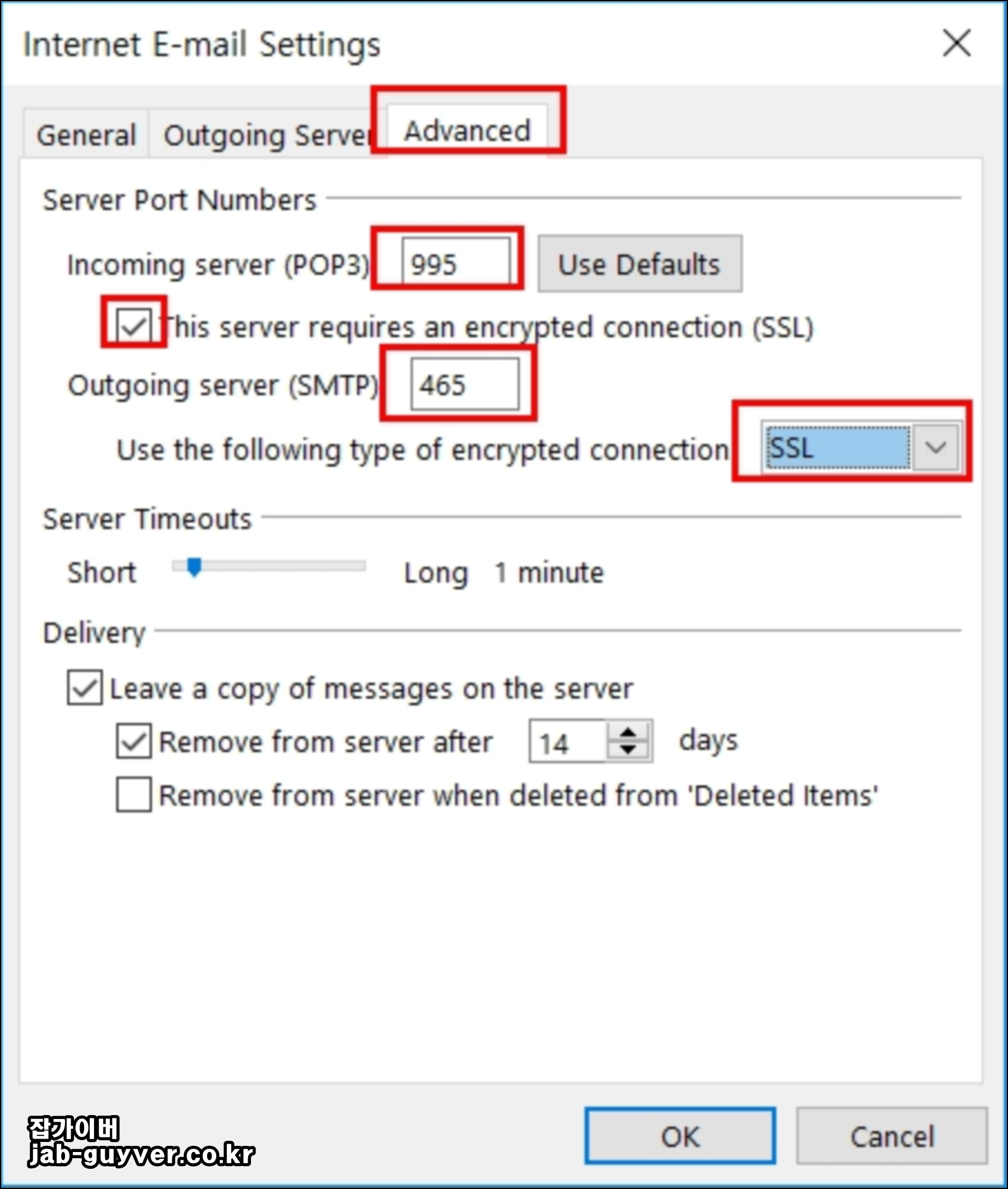 고급(Advanced) 탭에서는 네이버에서 안내한 포트와 보안 방식을 그대로 맞춰 주면 됩니다.