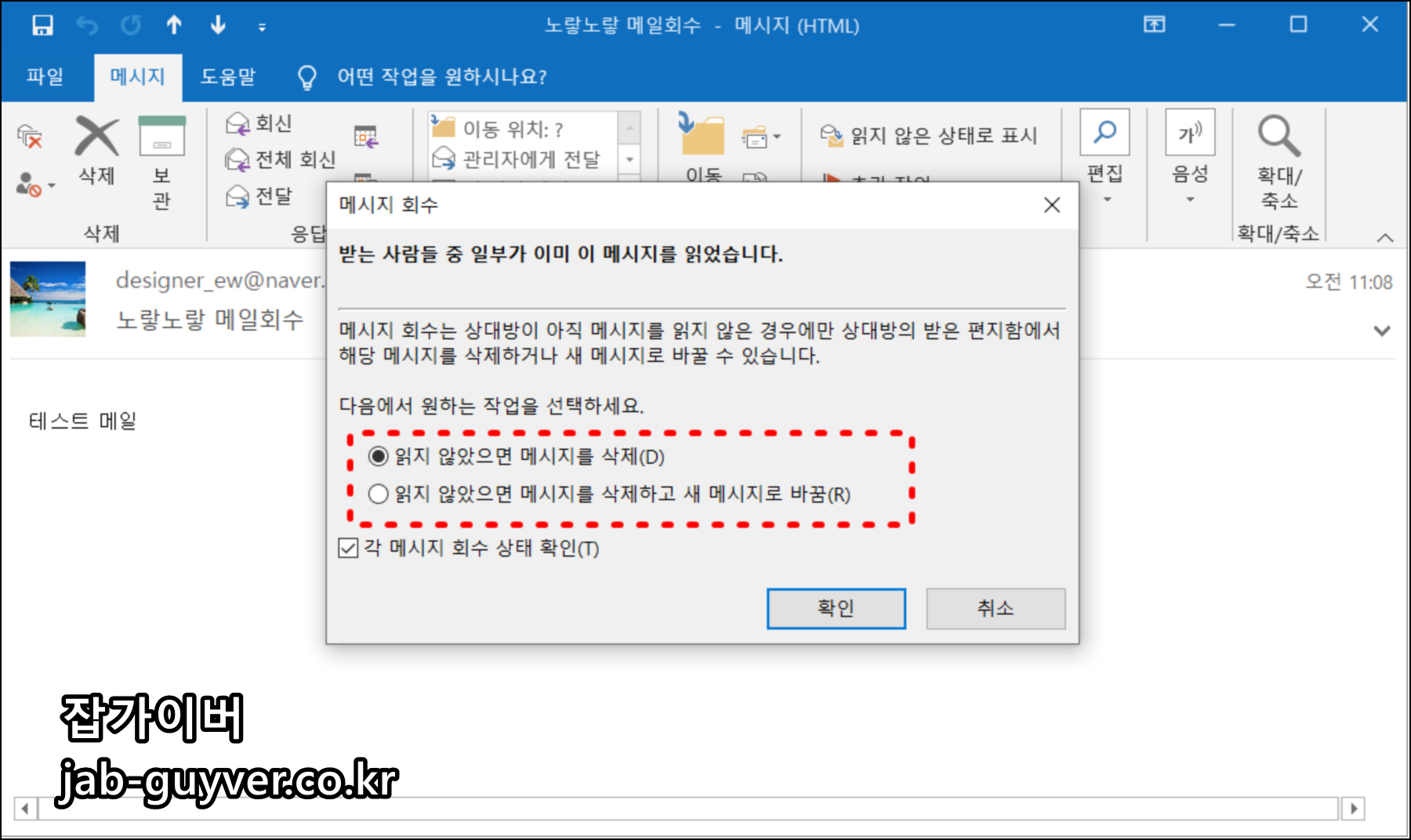 - 메시지 회수 – 받는 사람이 아직 읽지 않았다면 메일 삭제 또는 수정된 메일로 교체