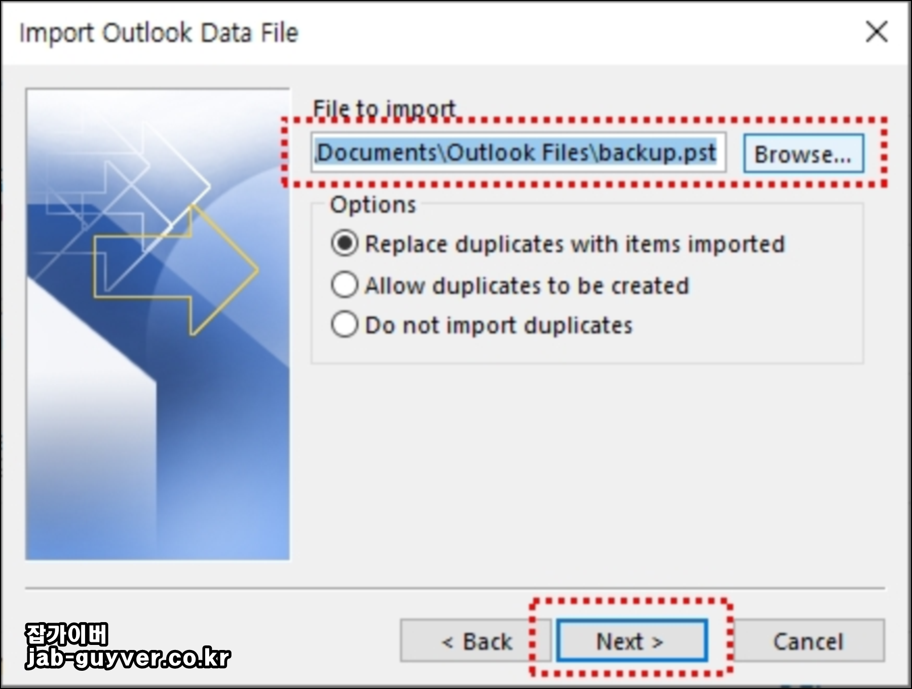 가져오기 파일 형식은 Outlook 데이터 파일(.PST)로 잡고, 백업해둔 파일을 지정하면 복구가 진행됩니다.