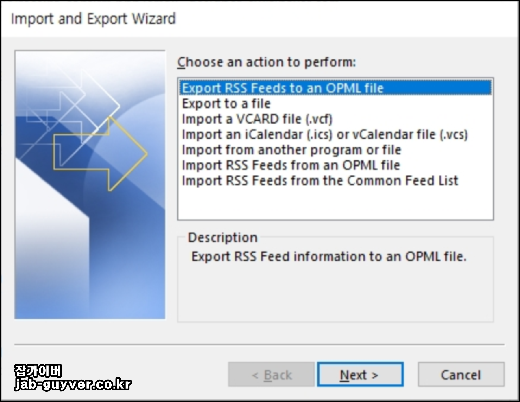 여기서 여러 포맷(OPML/VCF/ICS 등)이 보여도, 메일 백업 목적이면 내보내기 쪽을 잡고 Outlook 데이터 파일(.pst)를 선택합니다.