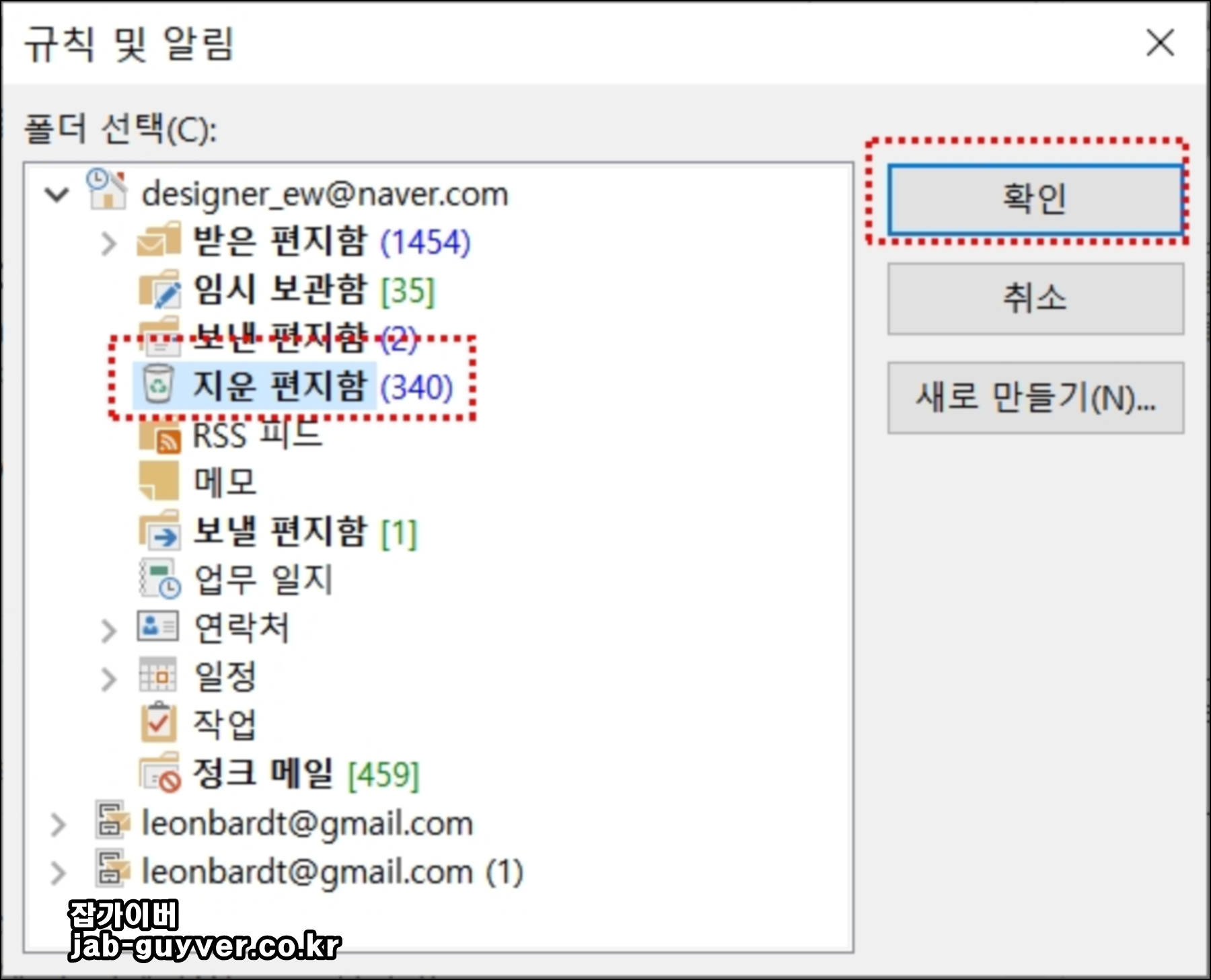 그리고 규칙에 대해 임시보관함 및 지운 편지함 등등 원하는 이동경로를 선택하면 보낸 사람의 모든 메일을 이동 및 삭제할 수 있습니다.