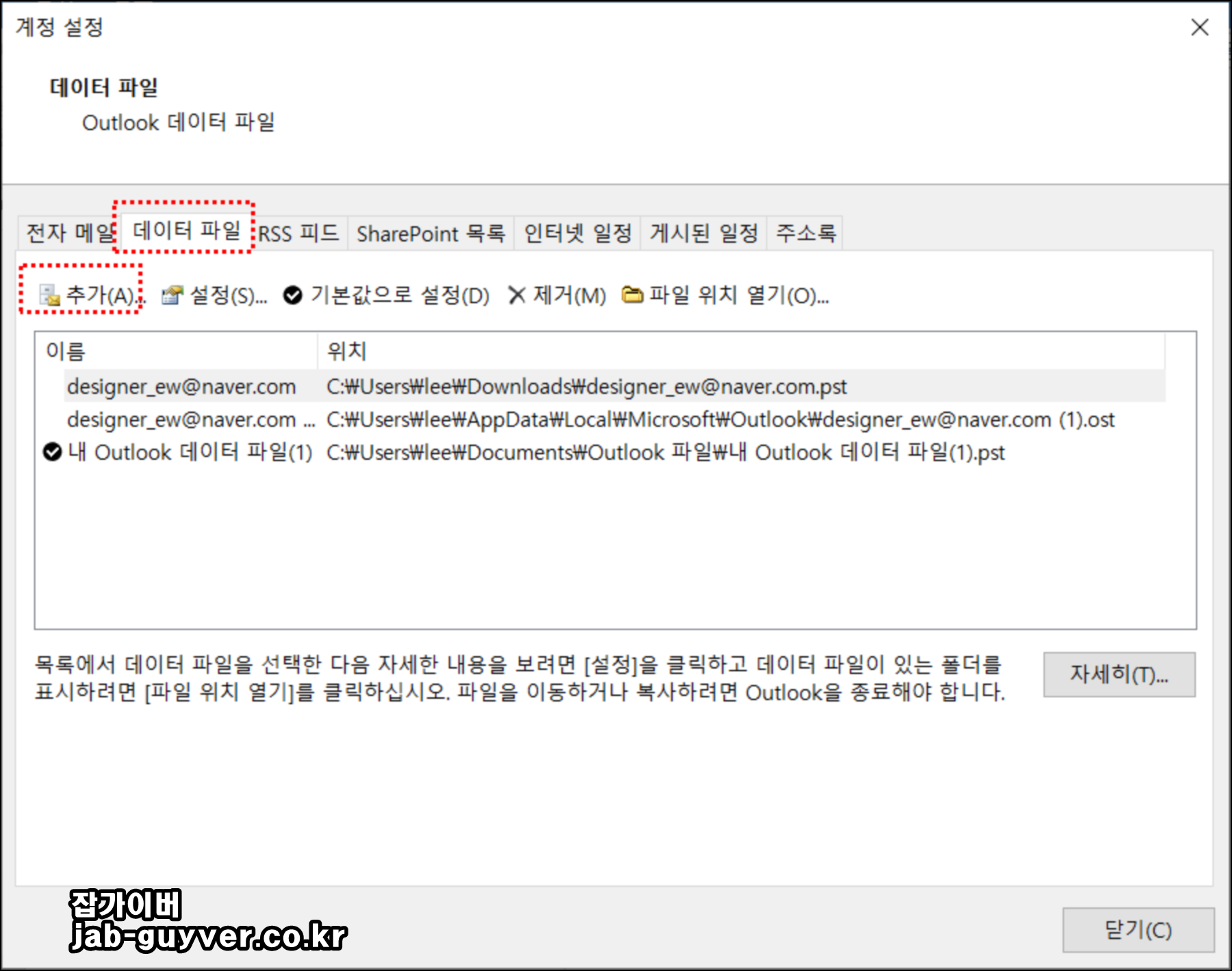 데이터 파일 -> 추가를 선택해 기존에 사용하던 PST 아웃룩 메일파일이 있다면 불러와줍니다.