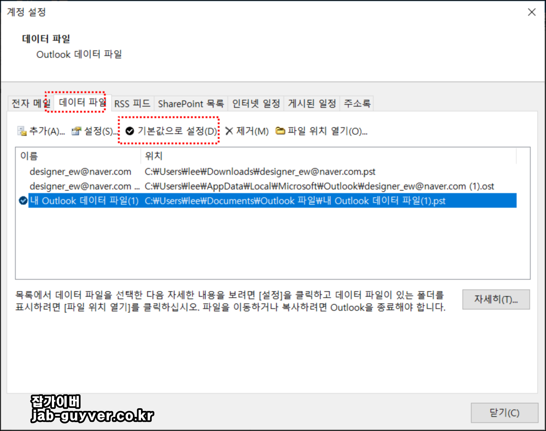그리고 별도로 메인으로 사용할 메일파일을 "기본값으로 설정"하면 해당 파일로 메일을 저장하도록 설정합니다.