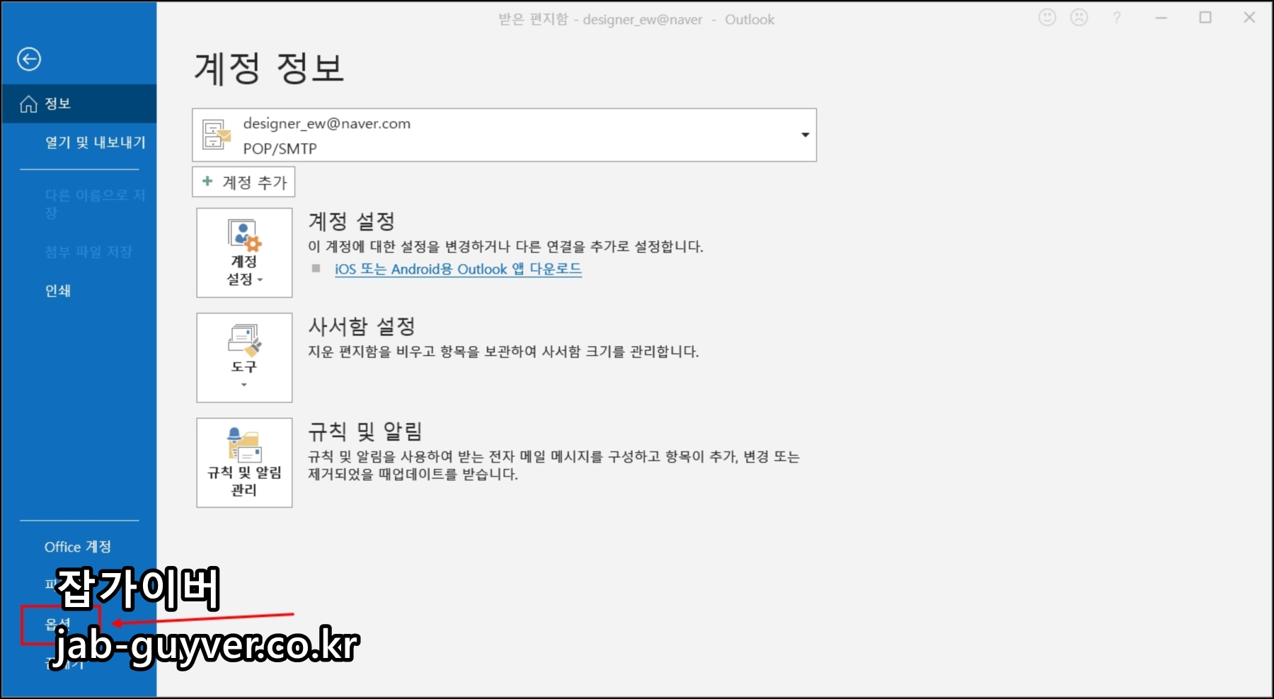 아웃룩을 실행 후 옵션으로 들어갑니다.