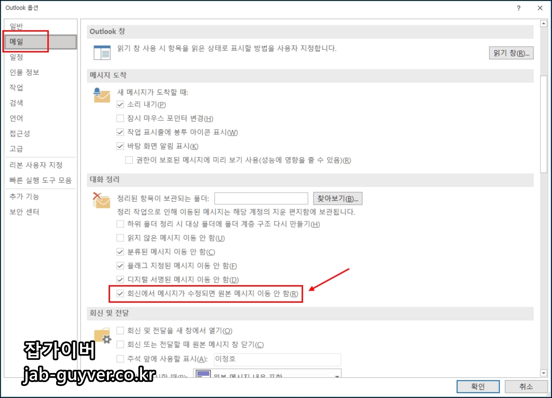 • 아웃룩 설정 한글판 : 파일 -> 옵션 -> 메일 -> 대화정리 ->회신에서 메시지가 수정되면 원본 메시지 이동 안 함