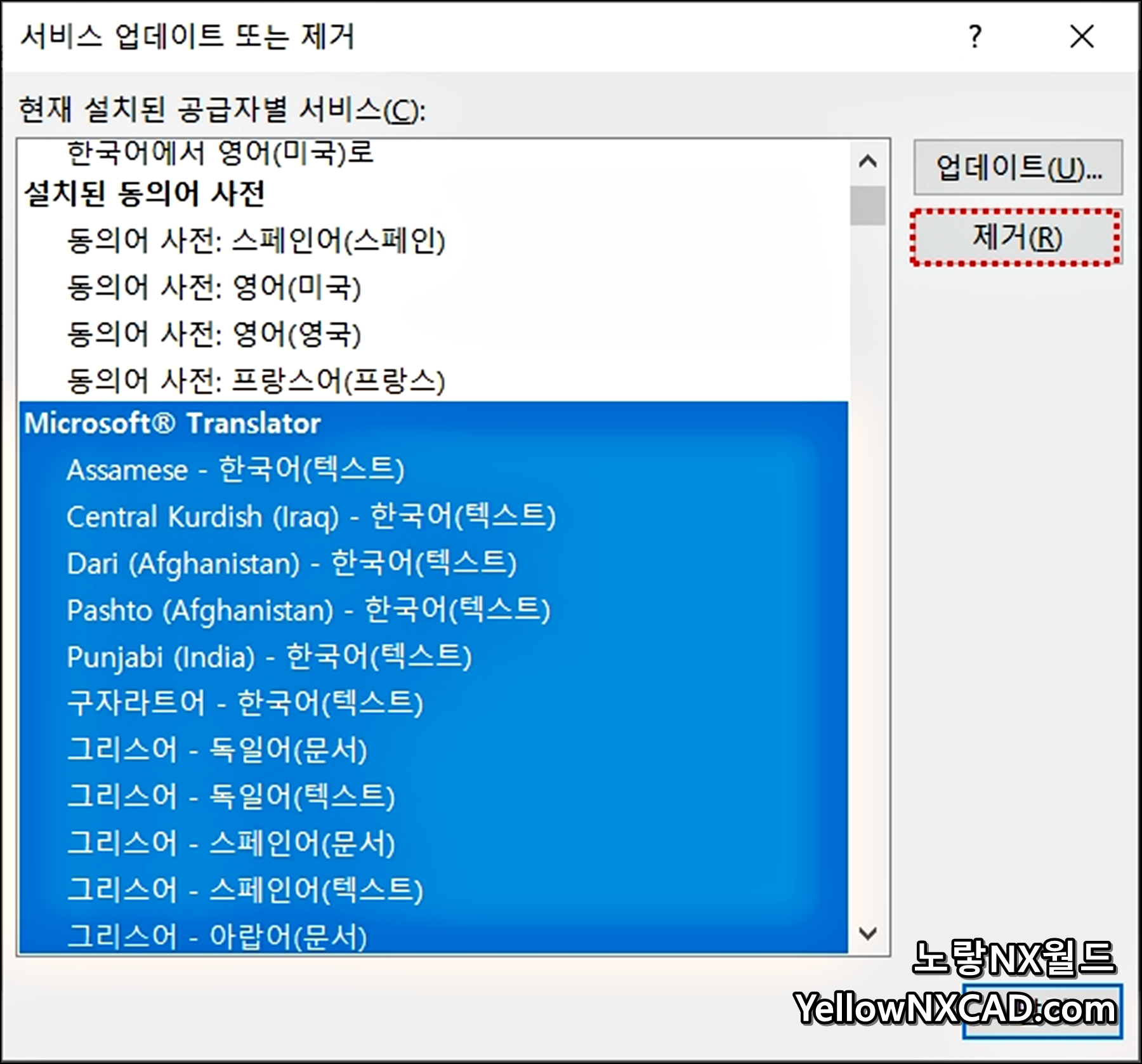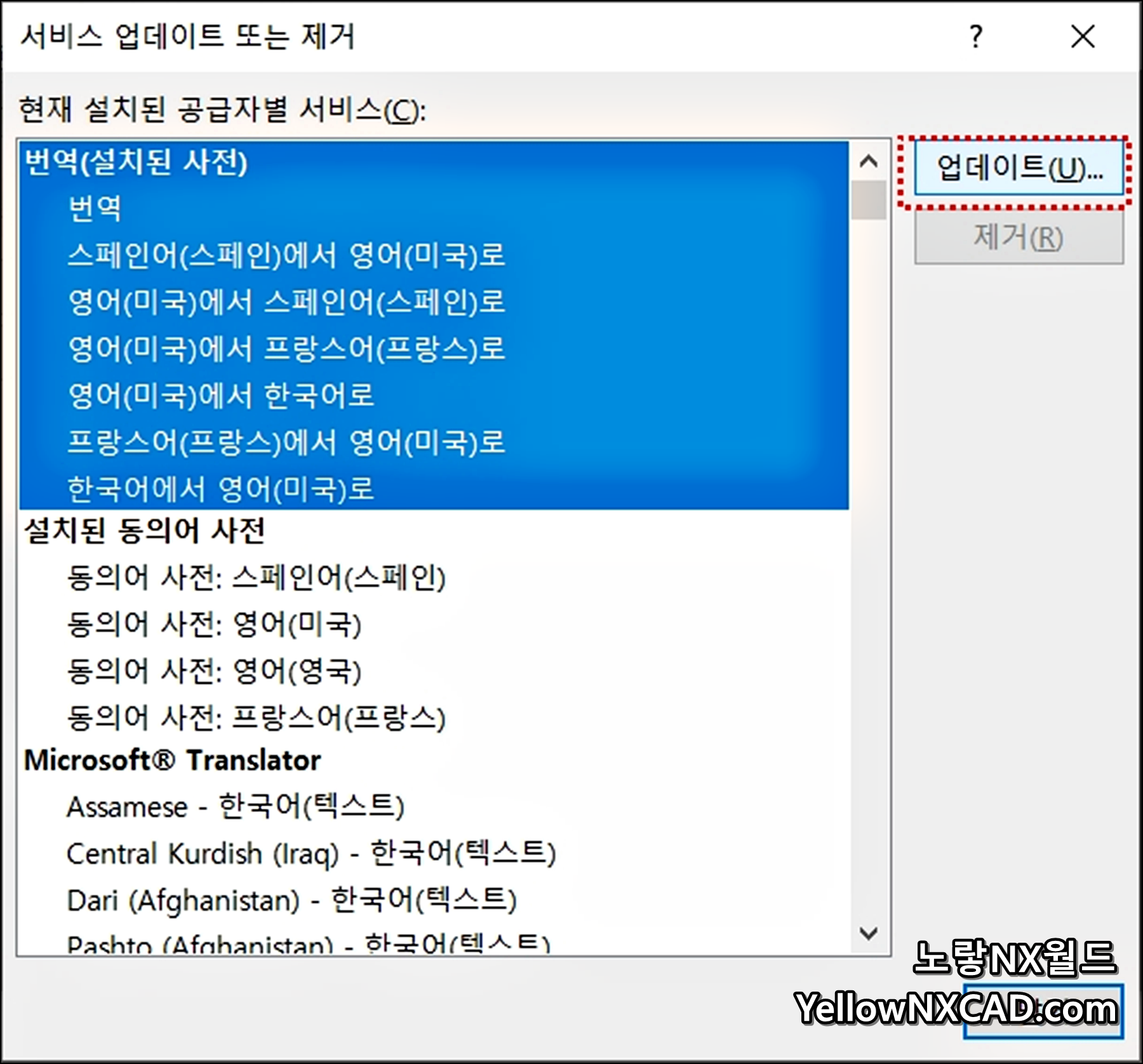여기서 번역된 각 언어를 업데이트하거나 제거할 수 있습니다.