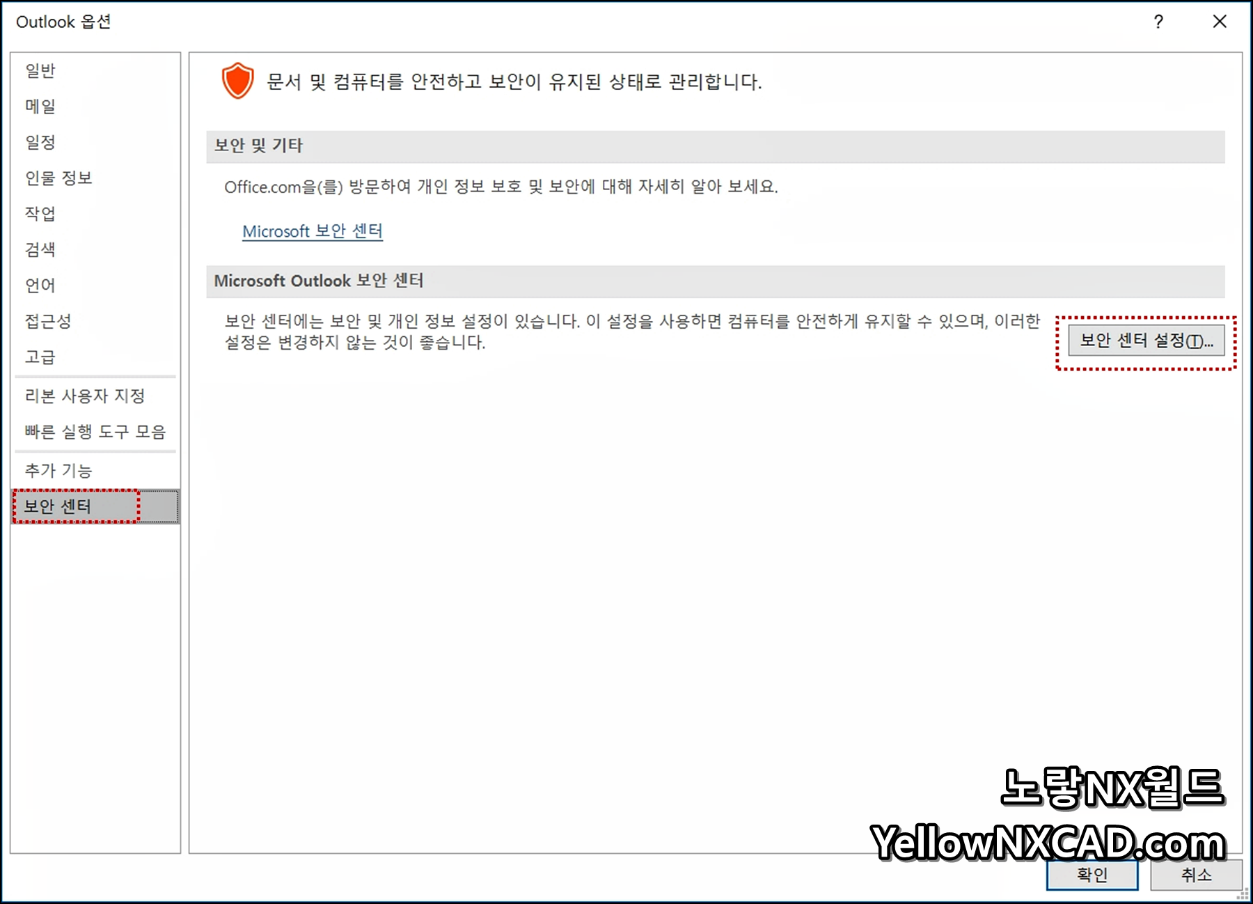 아웃룩을 실행 후 옵션 ->보안센터 -> 보안센터 설정으로 들어갑니다.