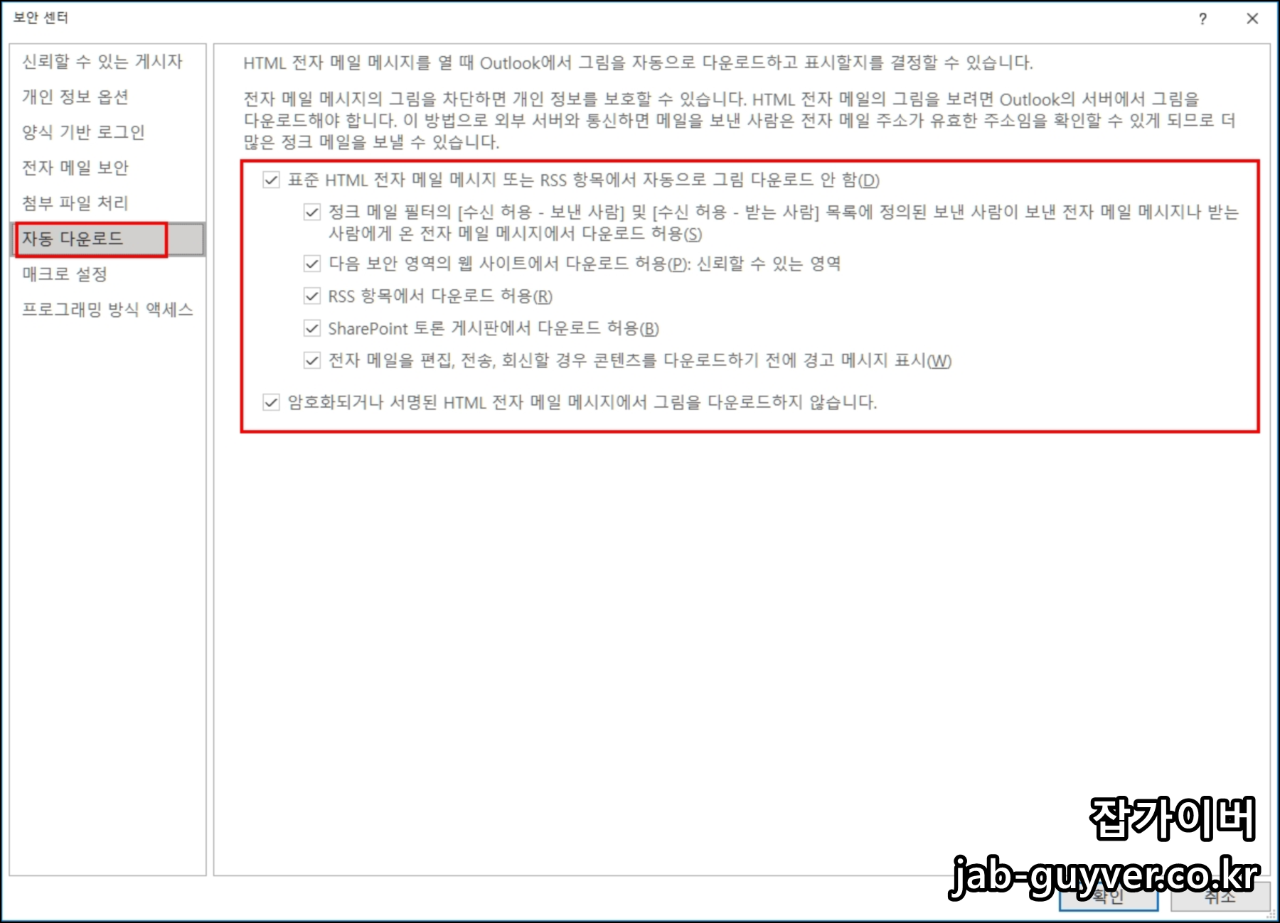 | 3 | 좌측에서 자동 다운로드 선택 | 그림 및 외부 콘텐츠 자동 다운로드 관련 옵션 설정 |