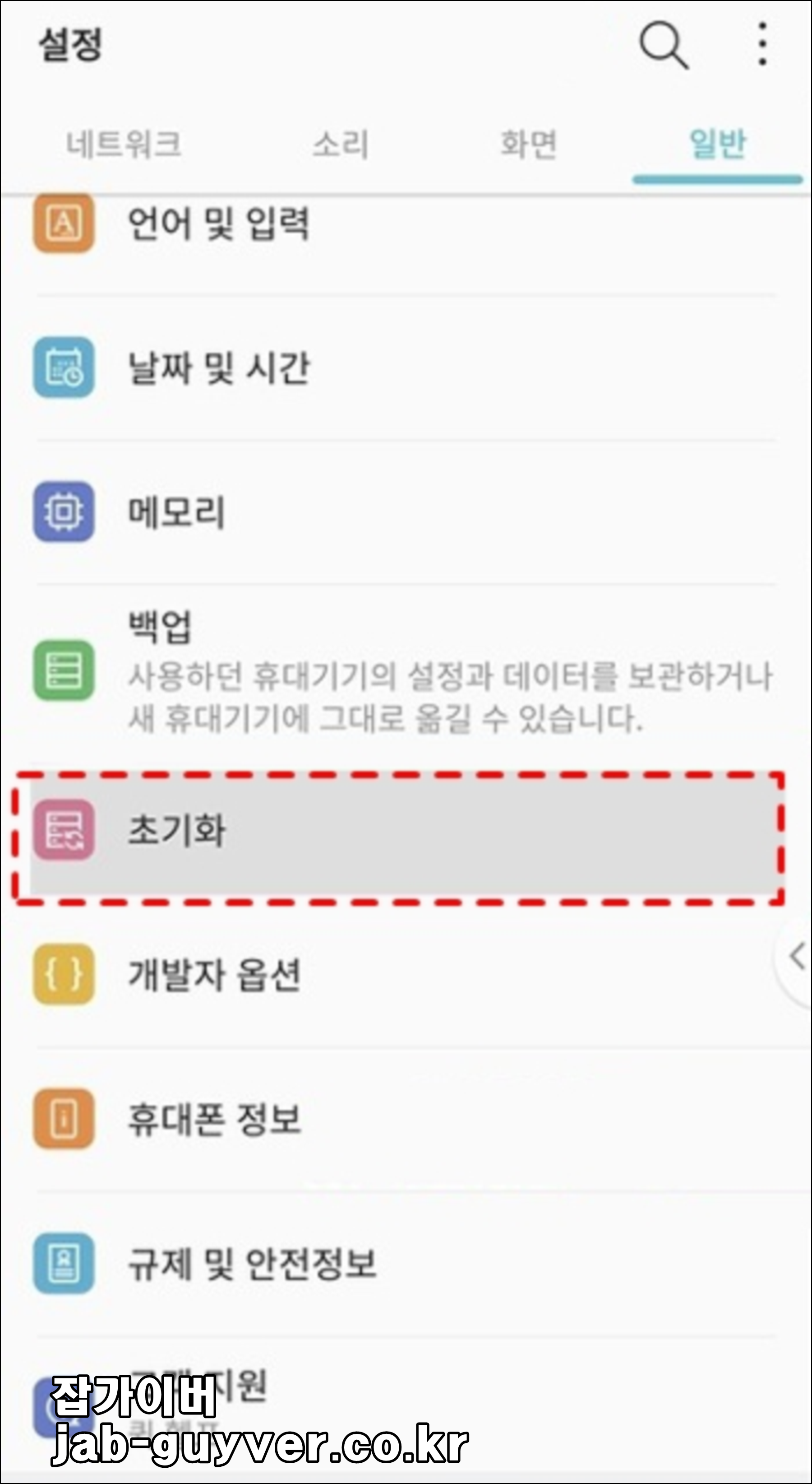 | 일반 초기화 (설정 메뉴) | 설정 > 일반 > 초기화 > 휴대전화 초기화 | 앱, 계정, 설정 포함 전체 초기화 |