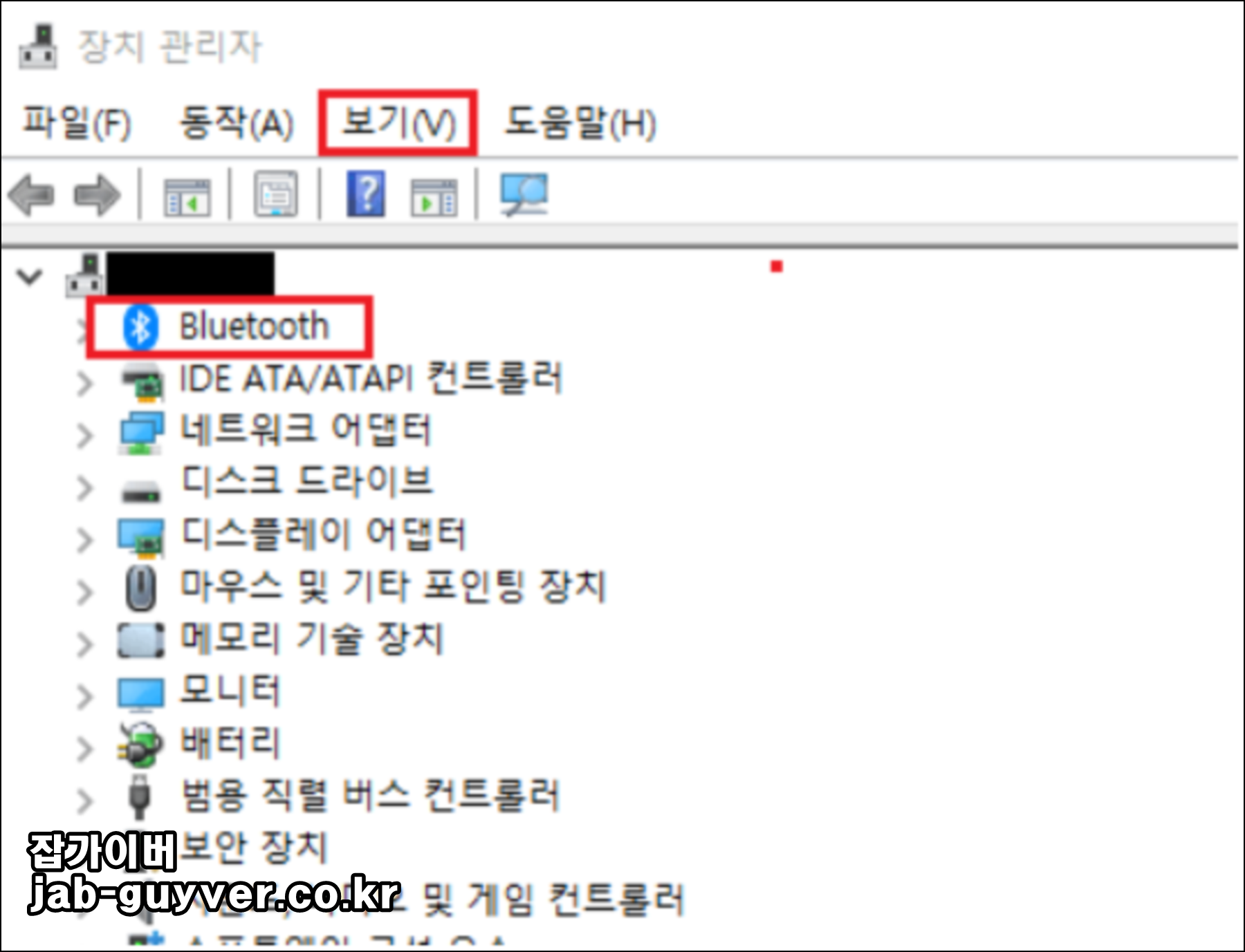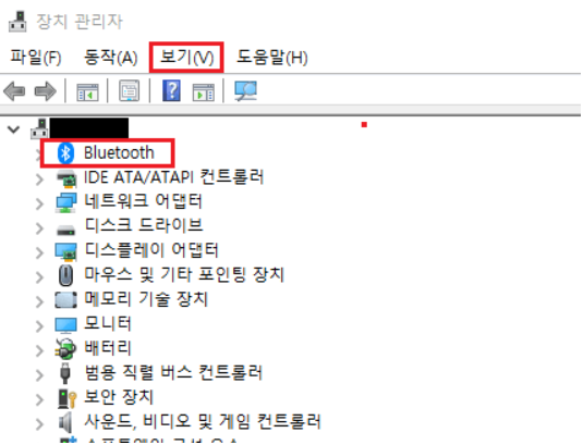 - 블루투스 드라이버가 정상 작동 중인지 장치 관리자에서 확인