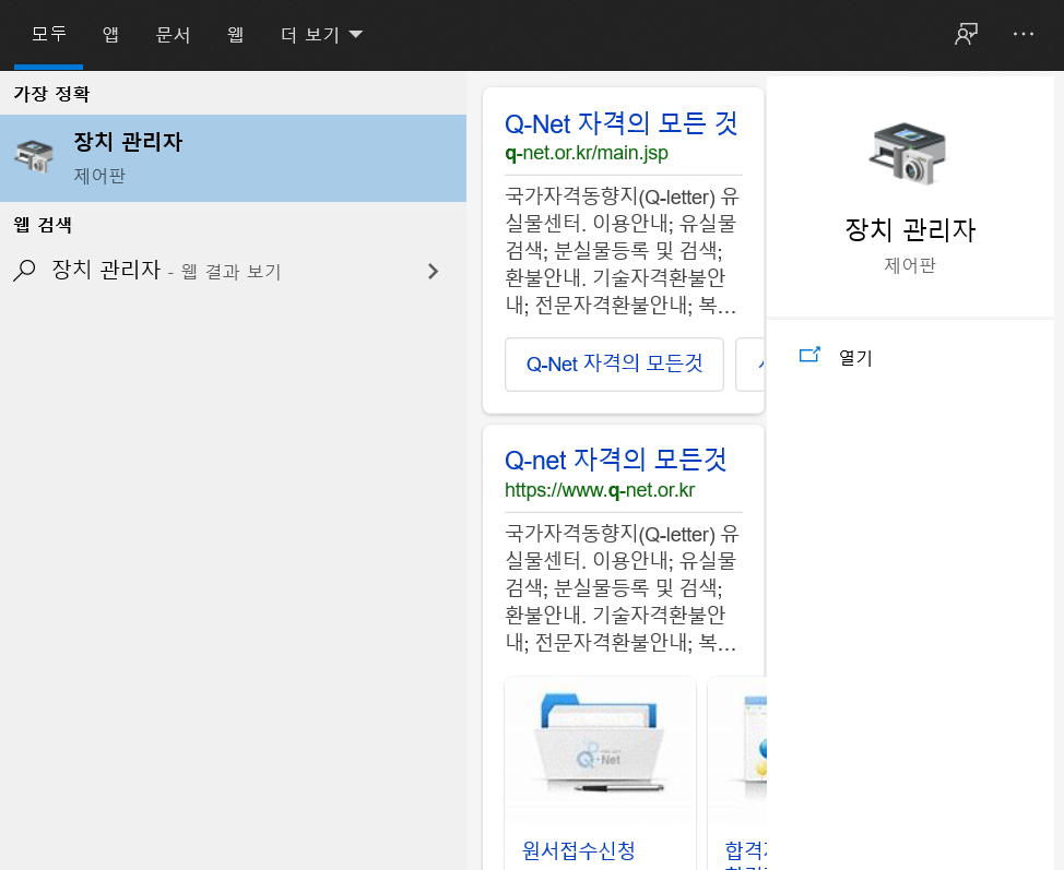 만약 이후에도 블루투스 기기와 연결이 되지 않는다면 장치관리자로 들어가 Bluetooth가 있는지 확인합니다.