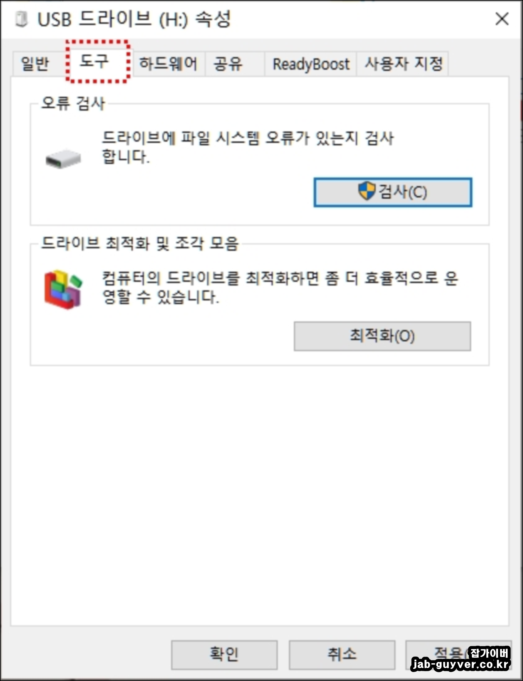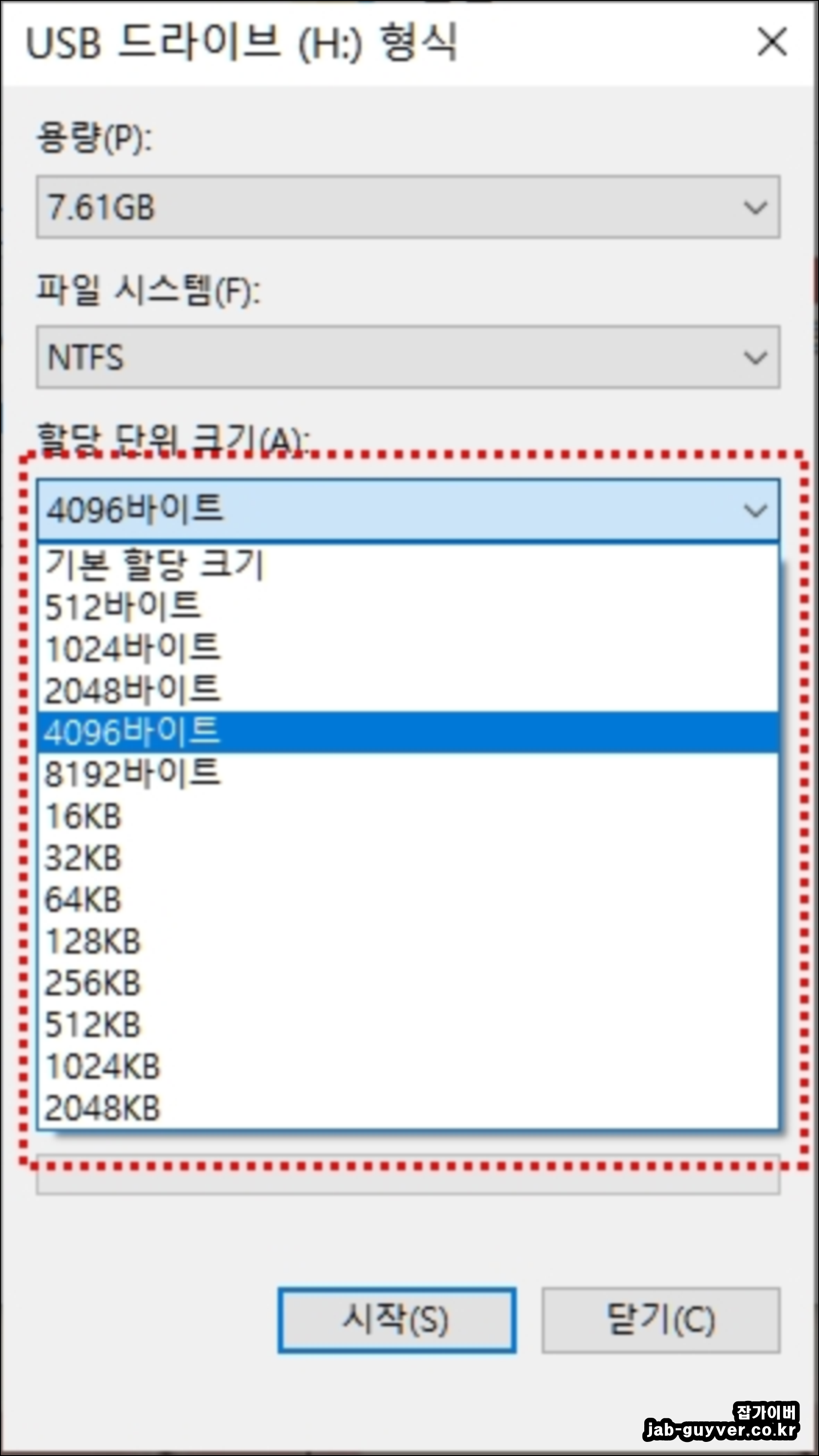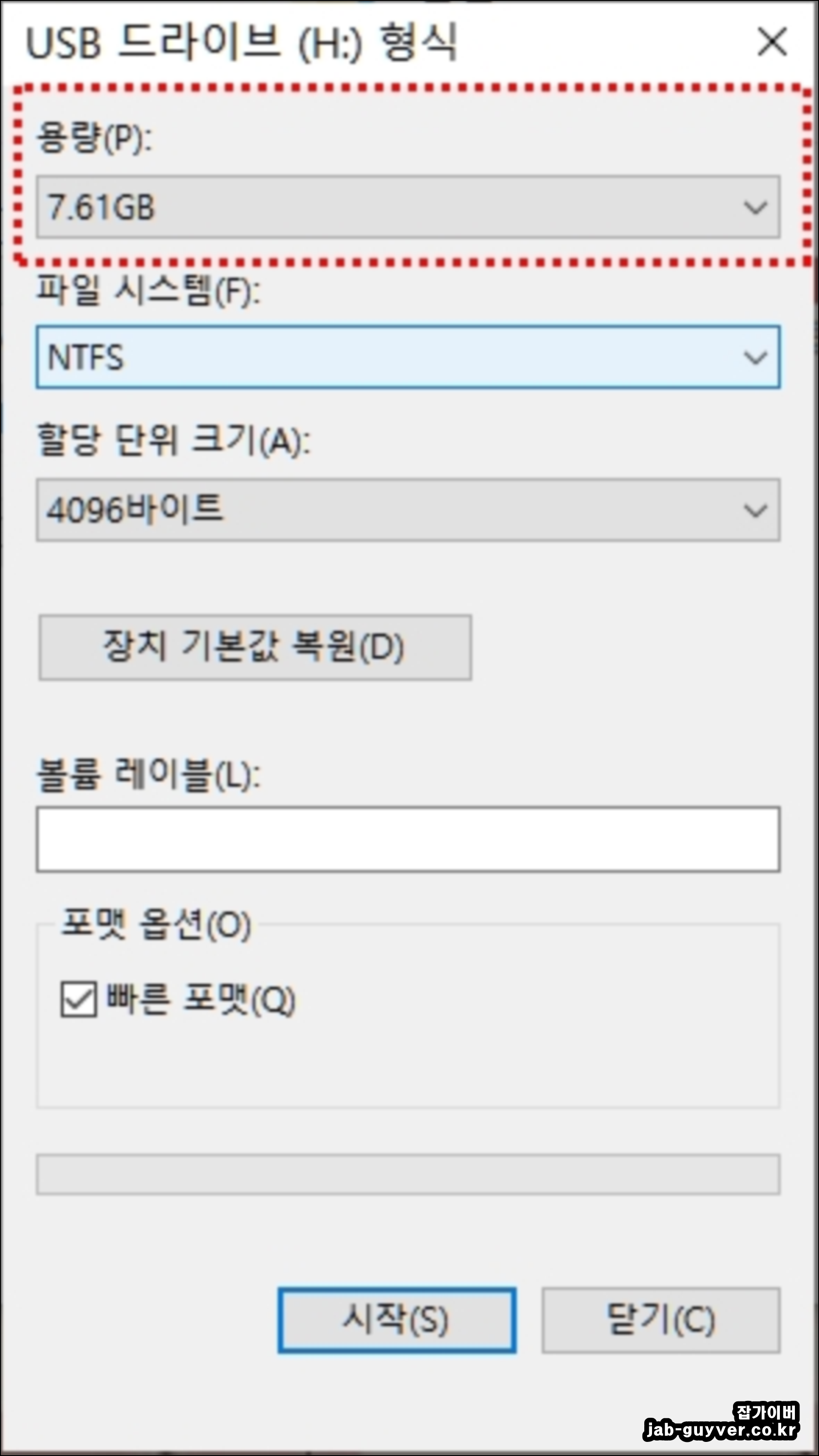 USB 드라이브를 포맷하기전 해당 USB의 용량이 맞는지 확인합니다.