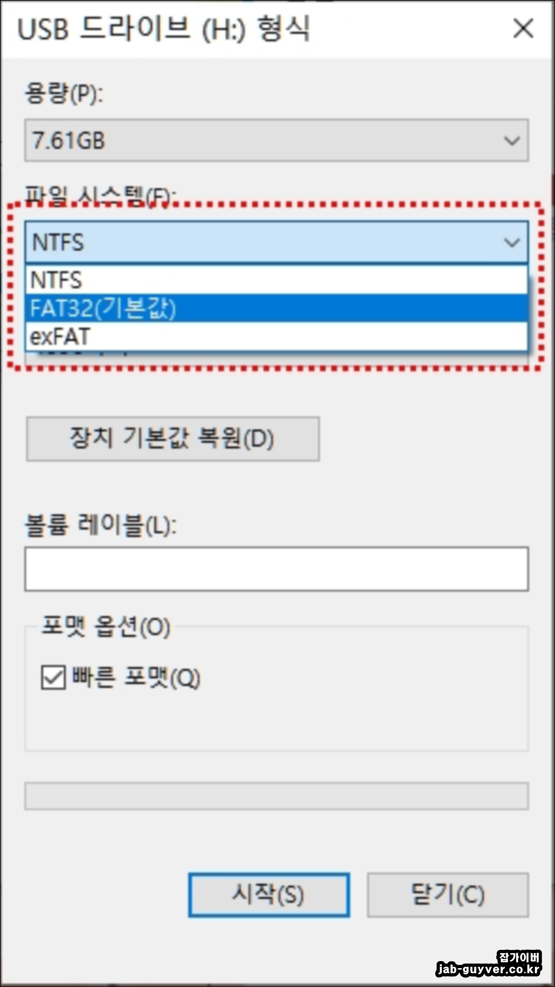 그리고 파일 시스템을 NTFS와 FAT32,exFAT 세가지중에서 선택합니다.