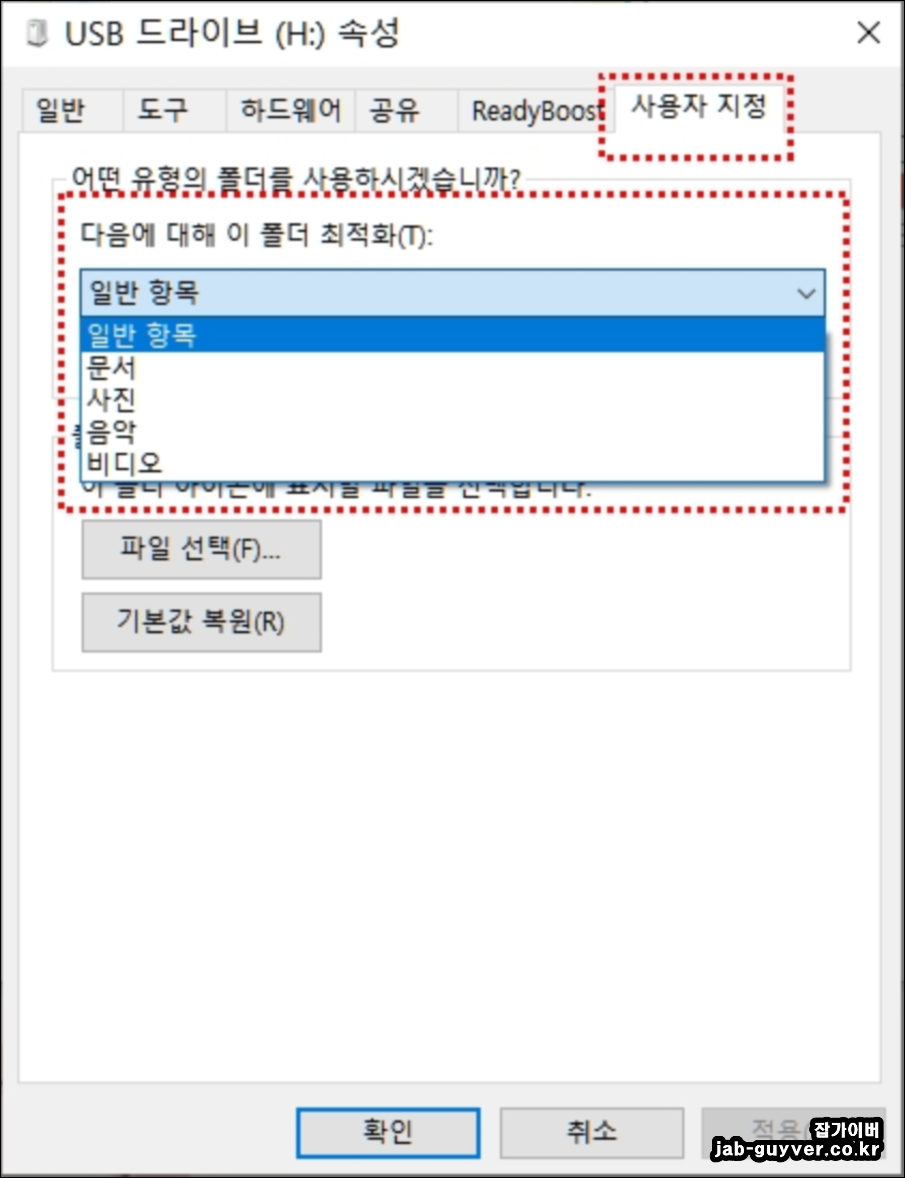 이렇게 USB를 모두 포맷했다면 사용자 지정을 통해 사용항목에 따라 최적화를 적용할 수 있습니다.