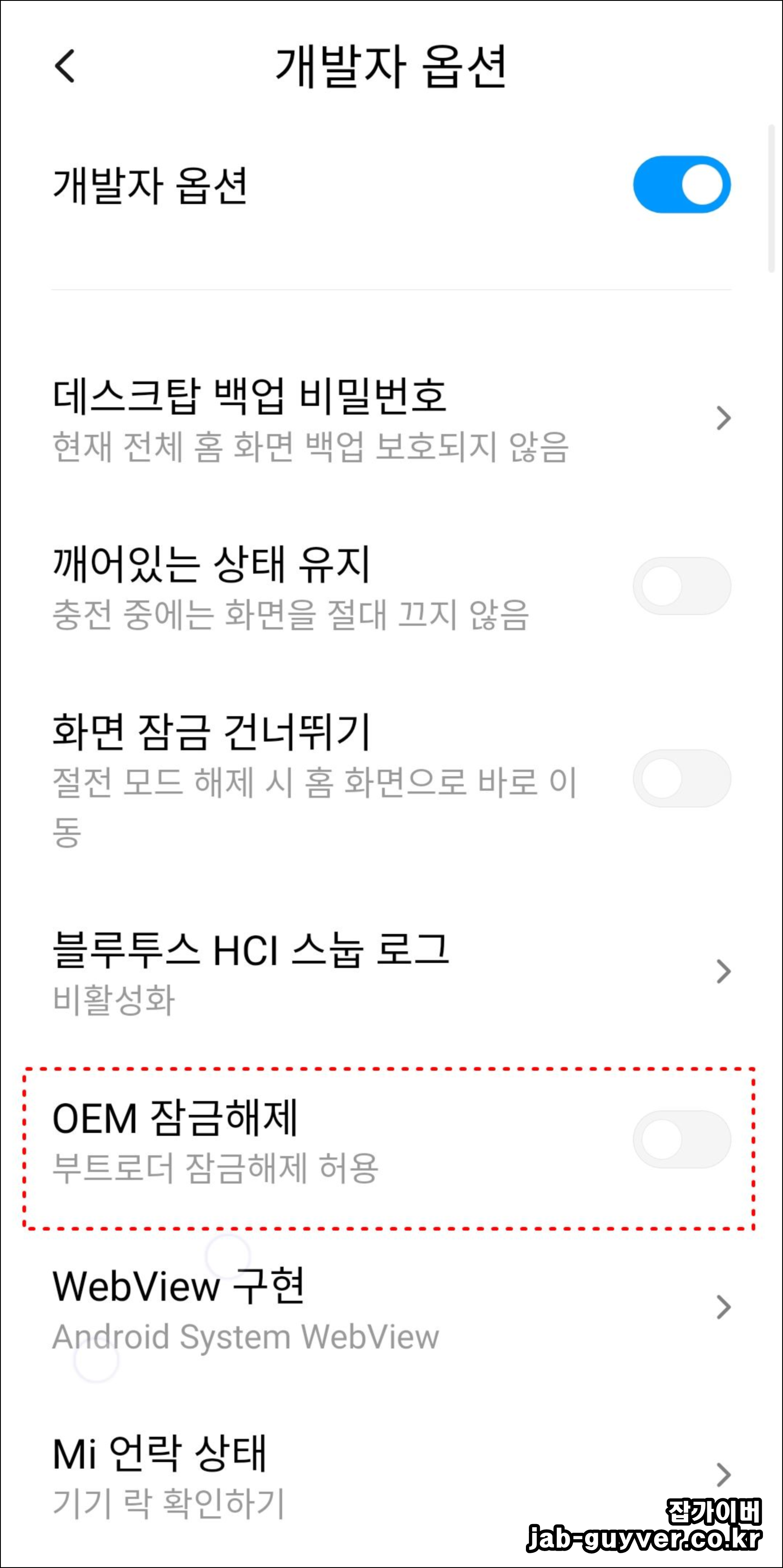 개발자 옵션에 OEM 잠금 해제 항목이 보일 수는 있지만, 이것만 켠다고 FRP(구글계정 잠김)이 자동으로 정리되는 방식은 아닙니다. 판매/양도 목적이라면 초기화 전에 계정 제거가 우선입니다.