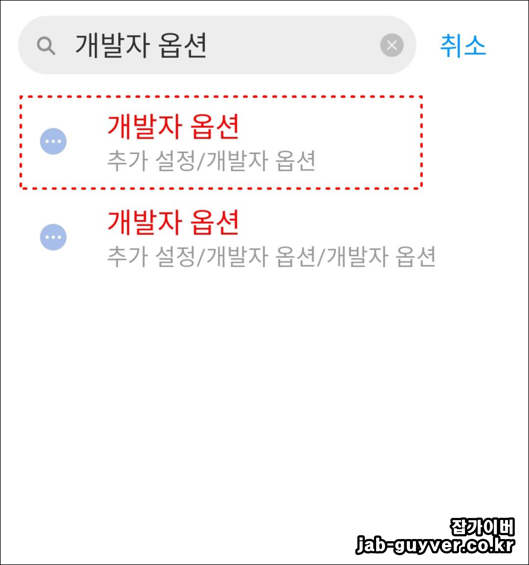 개발자 옵션이 켜졌다면 설정 검색창에 개발자 옵션을 찾아 들어갈 수 있습니다.