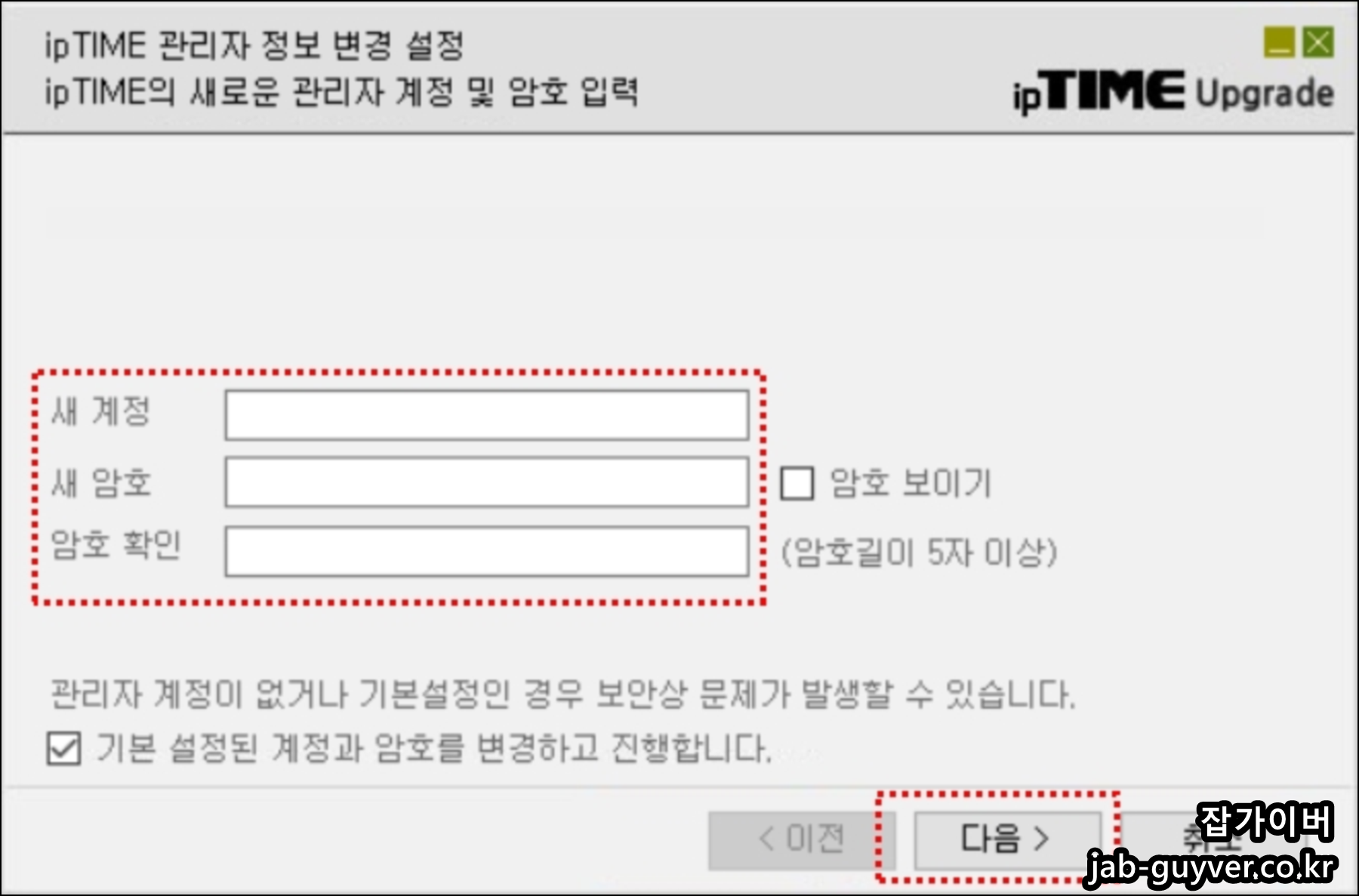 ipTime 관리자 정보변경을 위해 새롭게 계정 및 암호를 입력합니다.