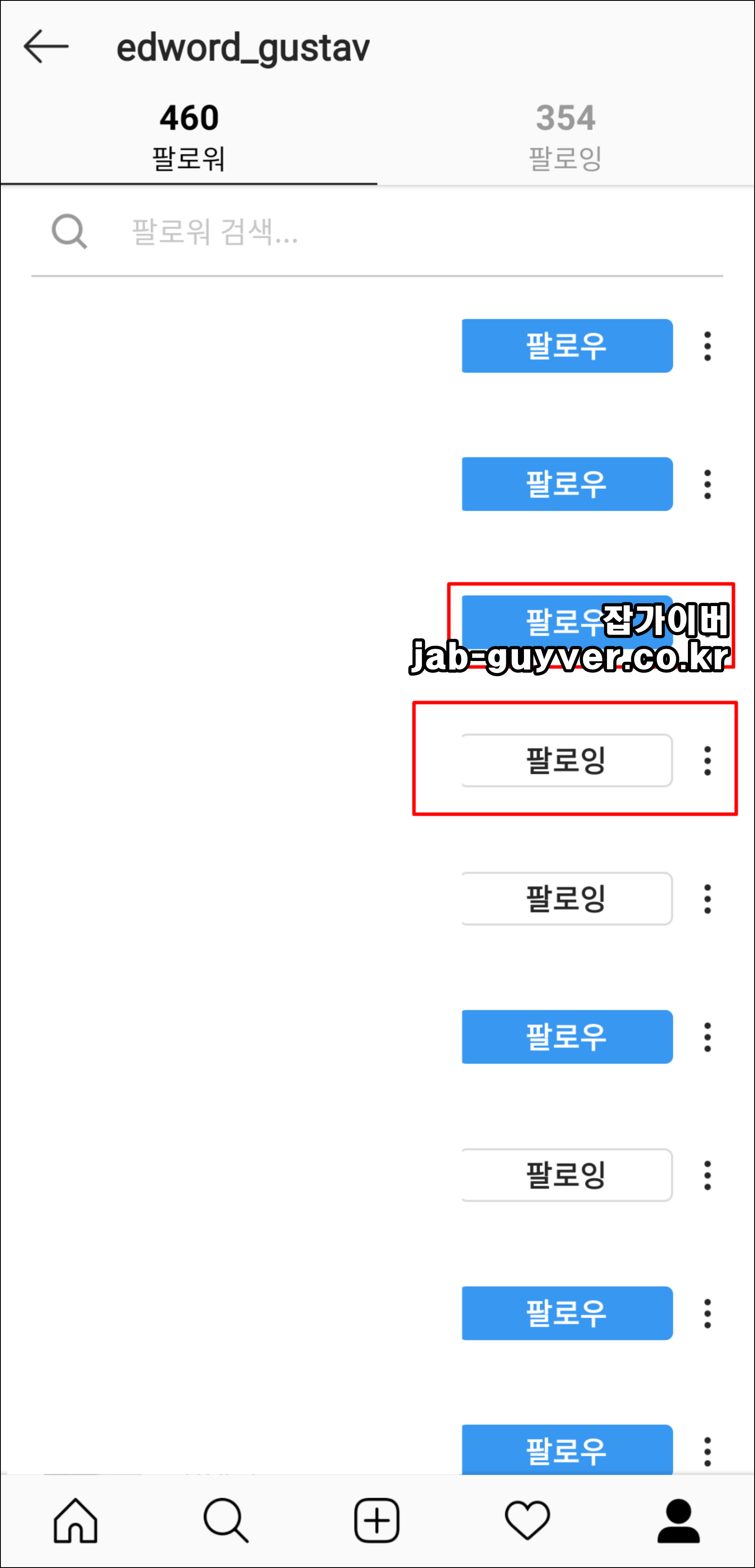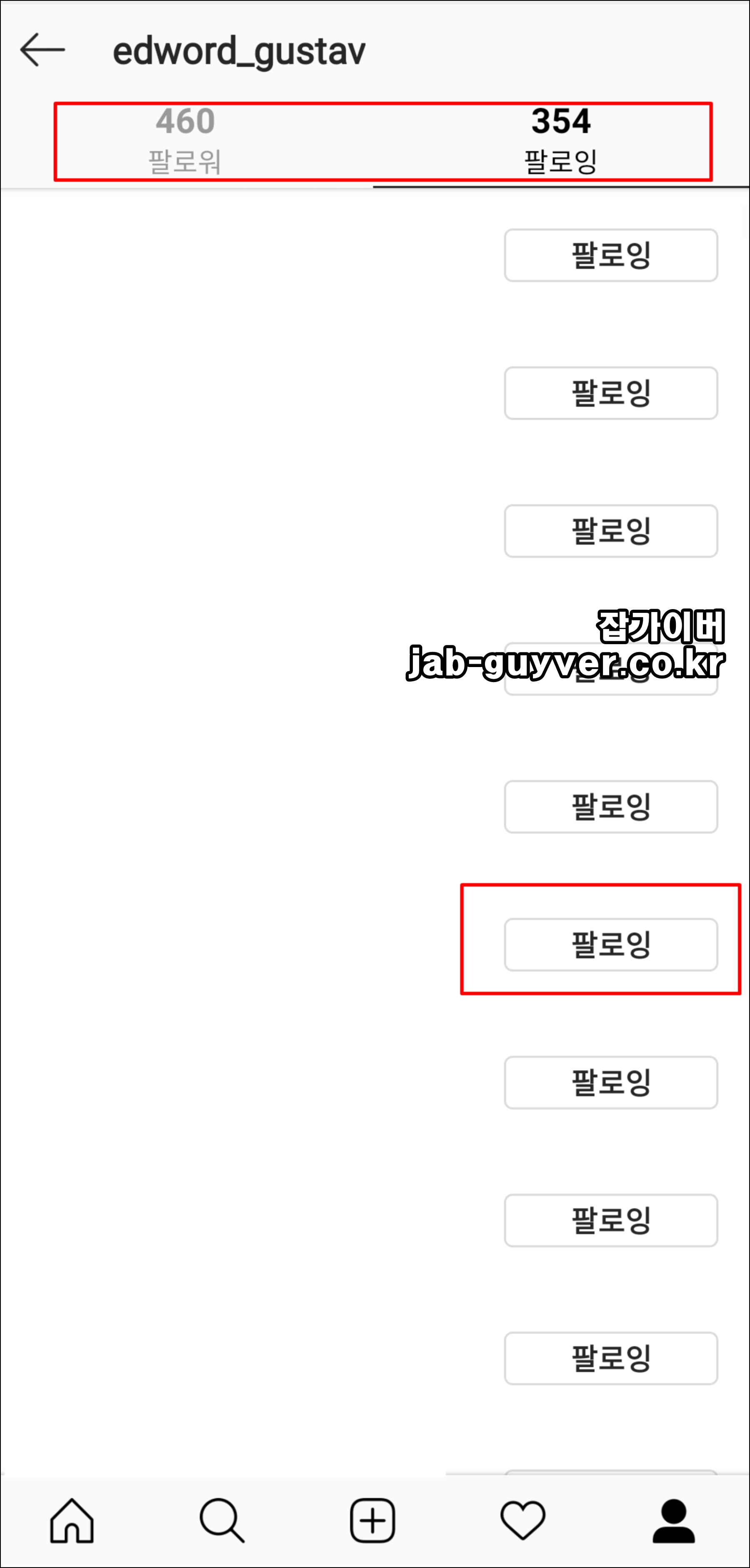 - 팔로우를 선택하면 현재 인스타그램 팔로잉 목록이 쭈욱나옵니다.
