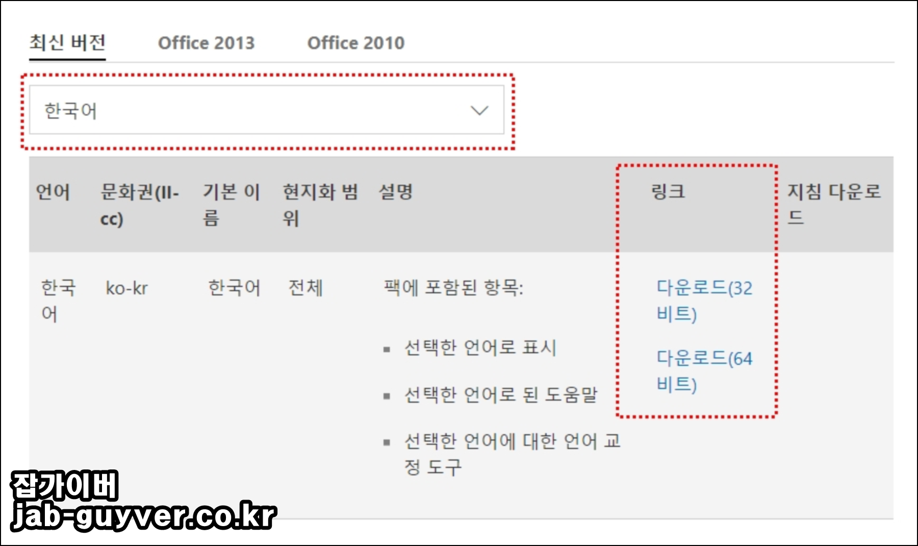 - 해당되는 언어팩 또한 32bit와 64bit로 나뉩니다.