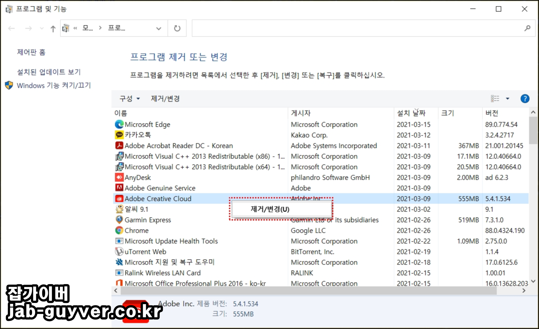프로그램 제거를 보면 Adobe Creative Cloud를 볼 수 있으며 선택 후 마우스 우클릭 후 제거/변경 눌러줍니다.