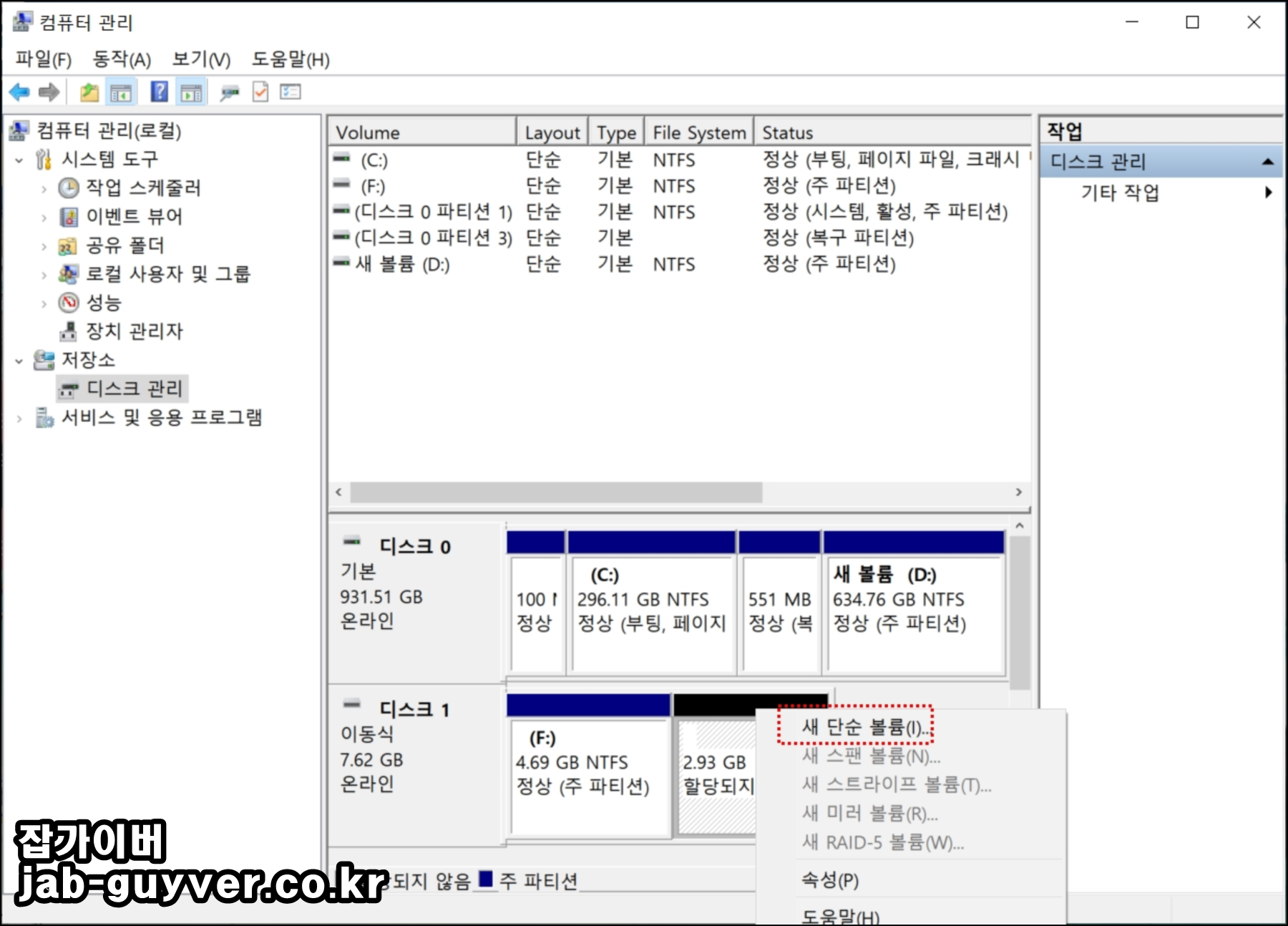내 PC를 우클릭해서 관리로 들어가면 왼쪽에 저장소가 있고, 그 아래 디스크 관리에서 새 디스크 상태가 잡힙니다.