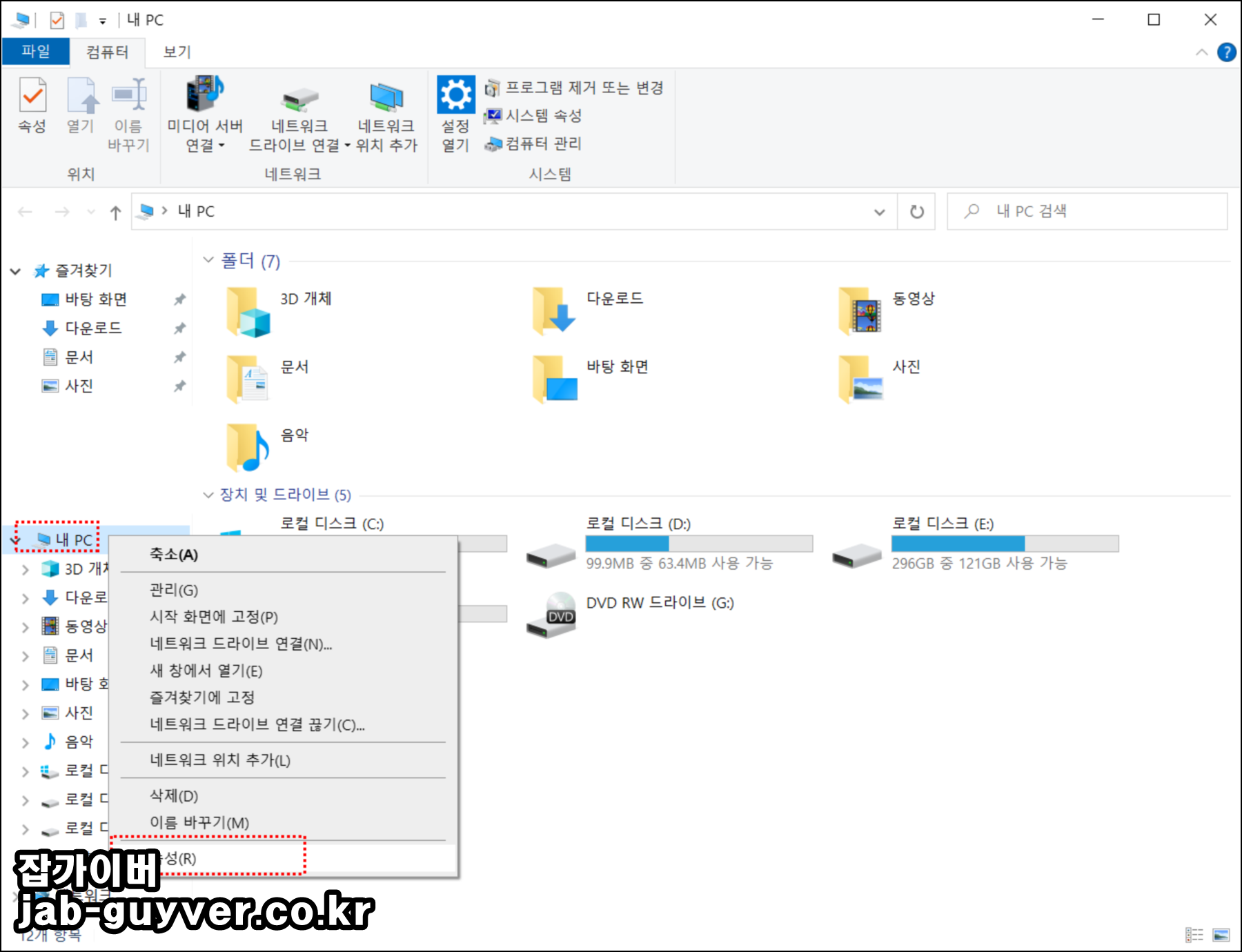 다른 방법으로는 내 PC를 마우스 우클릭 "속성"으로 들어갑니다.