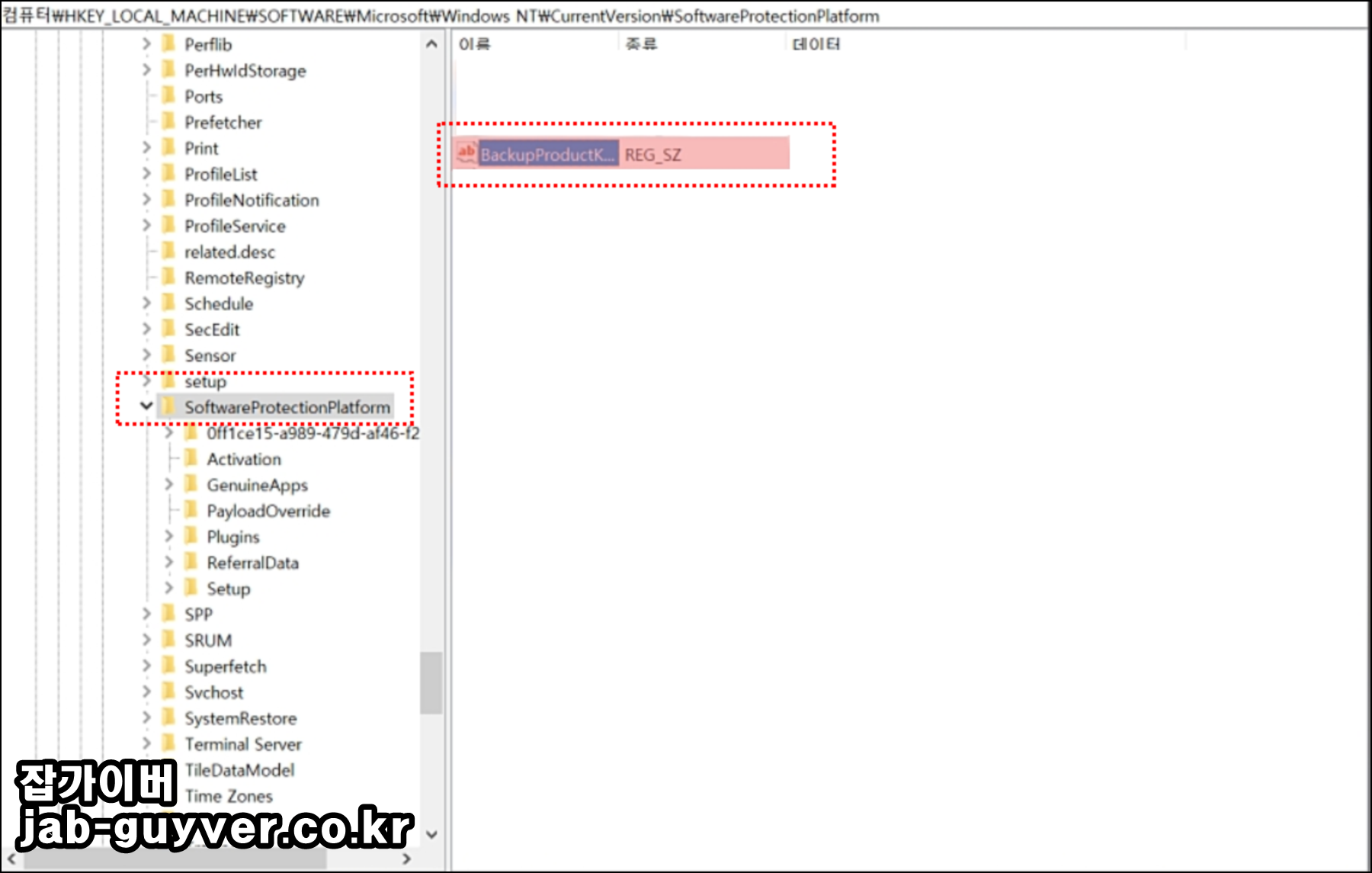 오른쪽에 BackupProduct.. 항목을 살펴보면 데이터 아래 '영문+숫자' 조합으로 된 윈도우10 제품키"윈도우10 시디키"를 확인할 수 있습니다.