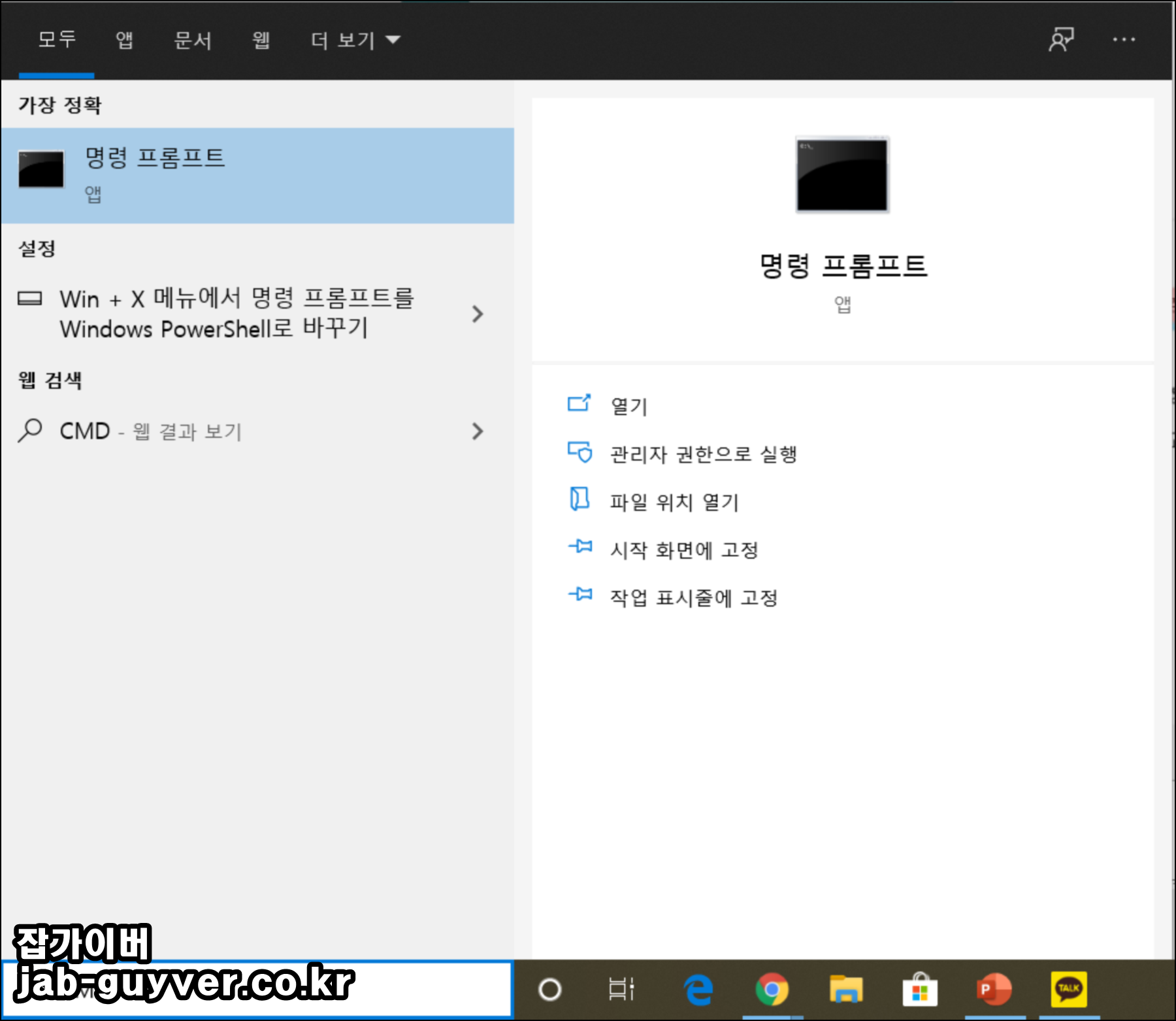 두 번째 CMD 명령프롬프트로 확인하는 방법으로 CMD를 관리자 권한으로 실행합니다.