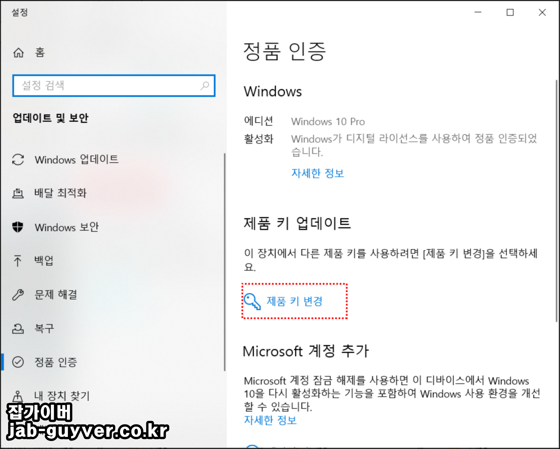 하단에 제품 키 업데이트 부분에서 "제품 키 변경"을 선택합니다.