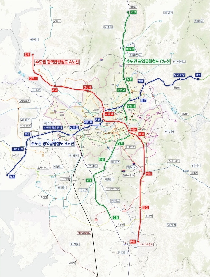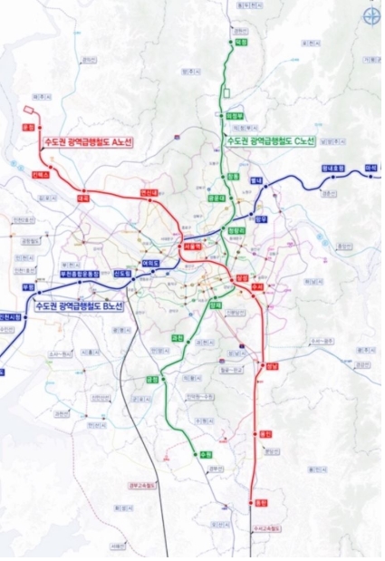 현재 GTX의 노선은 크게 A,B,C 세 개의 노선으로 나뉩니다.