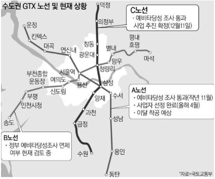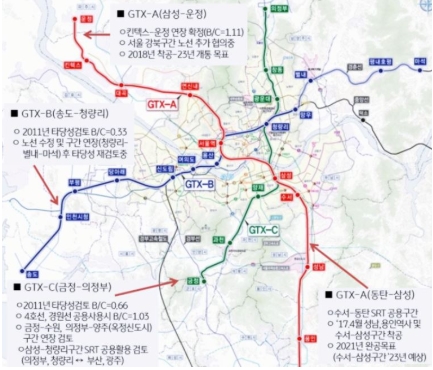 현재 진행상태로는 A노선의 "운정"에서 출발 "동탄"을 지나는 GTX 노선은 곧 완공이 될 예정이며 GTX B 노선의 경우 현재 "타당성 조사"가 진행 중입니다.