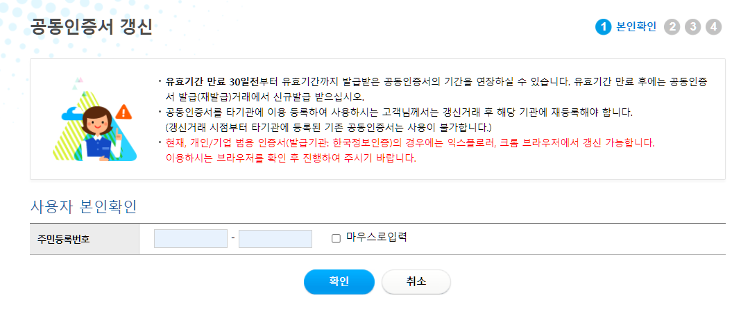 (갱신거래 시점부터 타기관에 등록된 기존 공동인증서는 사용이 불가합니다.) - 현재, 개인/기업 범용 인증서(발급기관: 한국정보인증)의 경우에는 익스플로러, 크롬 브라우저에서 갱신 가능합니다.