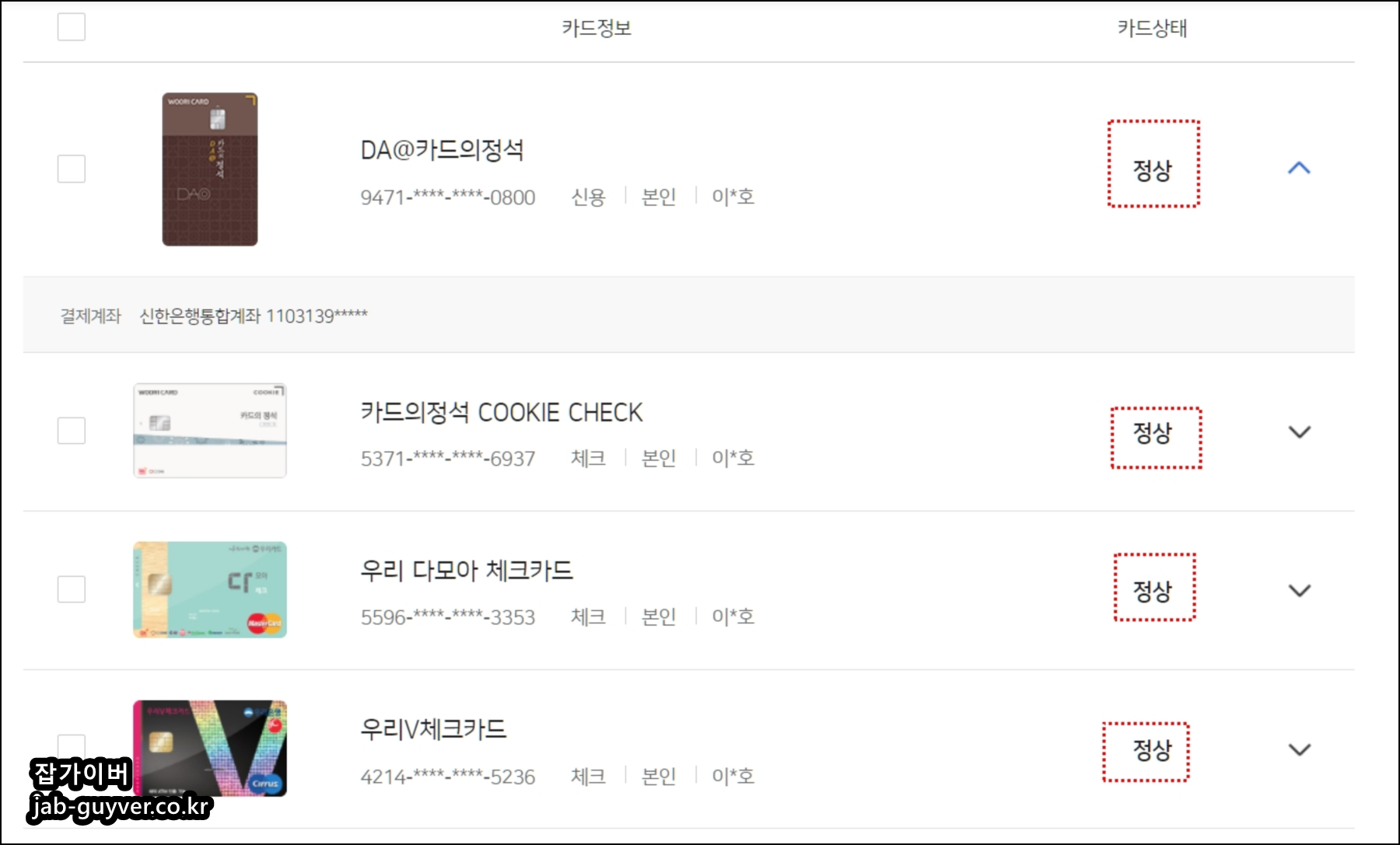여기서 보유 카드 목록이 보이고, 카드 상태가 분실인지 해지인지 바로 확인됩니다.