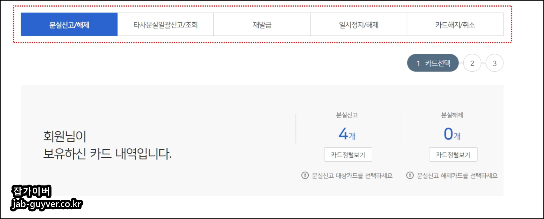 상단 탭을 이용해 카드 분실 및 해제, 재발급, 일시정지, 카드 해지 등이 가능합니다.