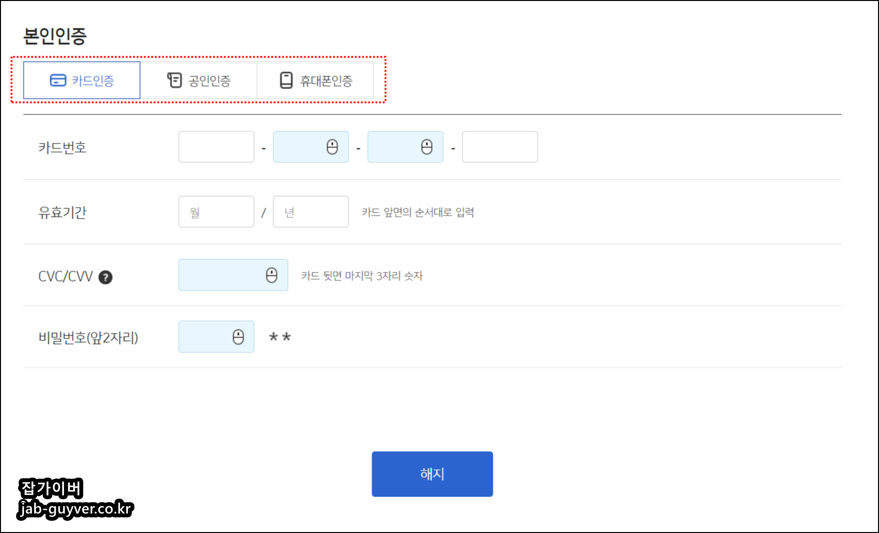 해지를 위해서는 3가지 인증 중 하나를 사용합니다.