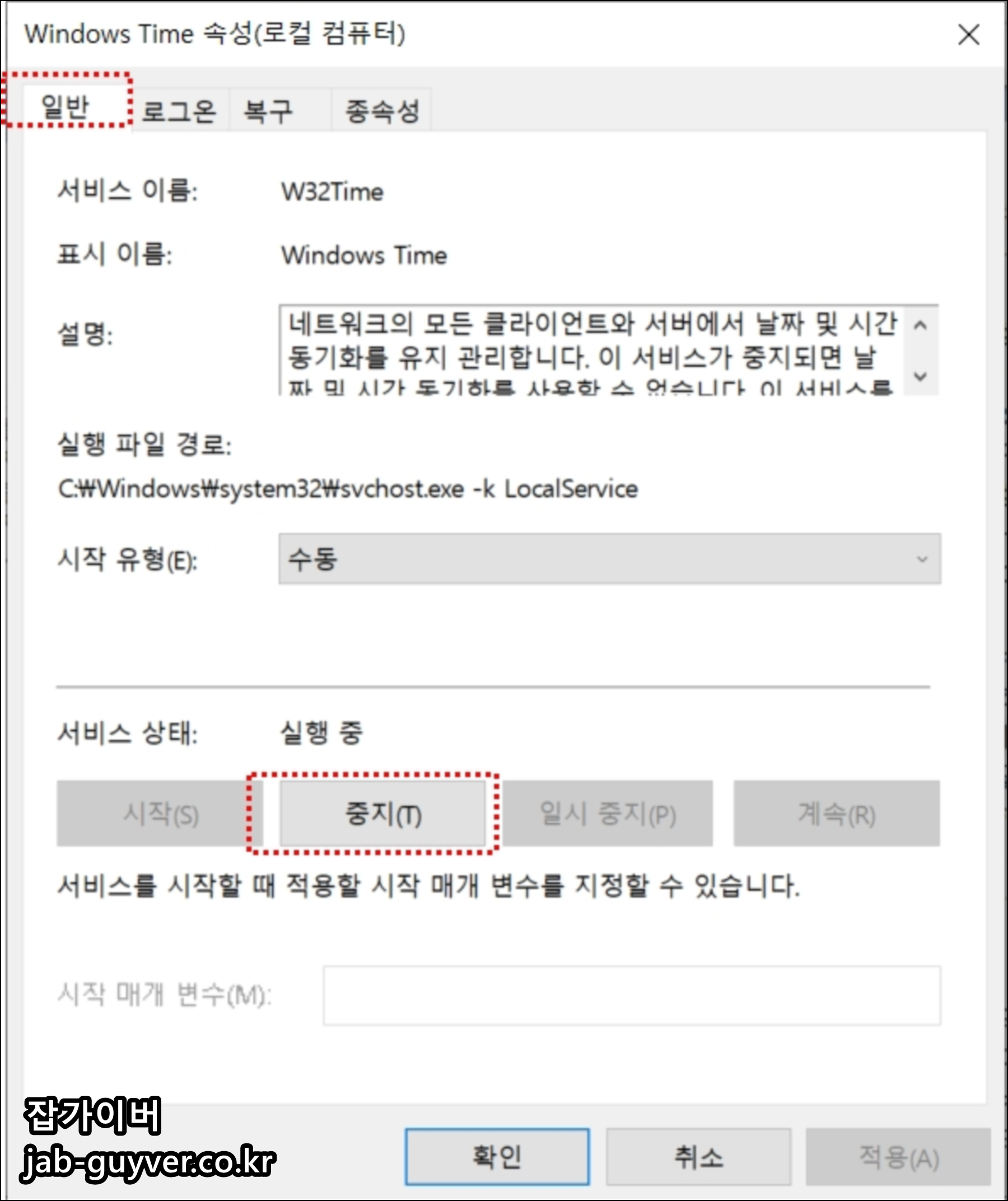 상태가 중지됨으로 되어 있다면 먼저 서비스를 중지한 뒤, 시작 유형을 ‘자동’으로 바꾸고 다시 시작해 줍니다. 이렇게 해 두면 부팅할 때마다 네트워크에 연결된 다른 장비, 혹은 인터넷 시간 서버와 시간을 맞추려는 동작이 안정적으로 동작합니다.