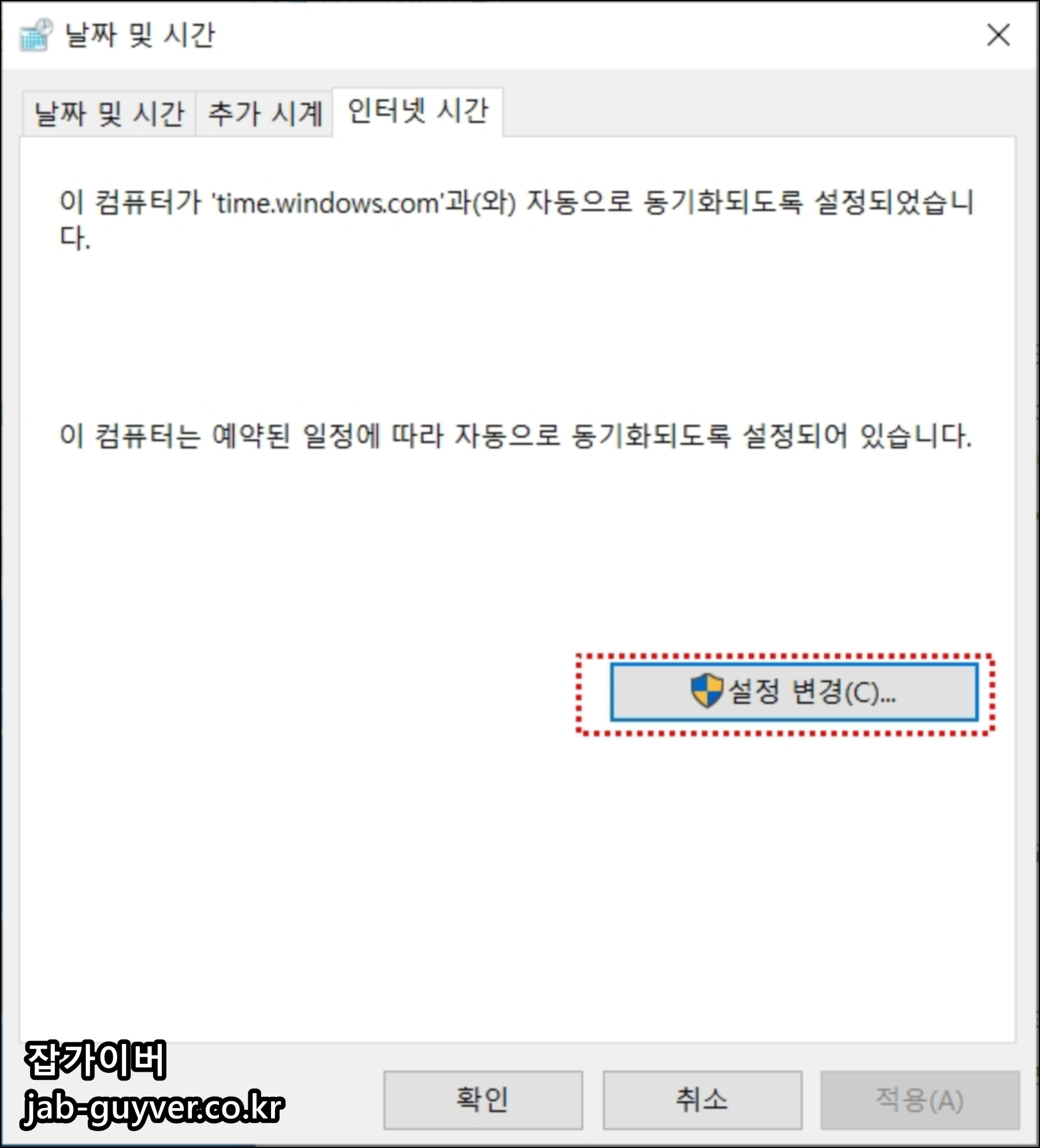 인터넷 시간 탭으로 이동한 다음 설정 변경을 눌러 주면, 컴퓨터가 일정 간격으로 인터넷 시간 서버와 자동 동기화하도록 설정할 수 있습니다. 이 기능이 꺼져 있거나 서버 주소가 잘못되어 있으면 동기화가 제대로 이뤄지지 않을 수 있습니다.
