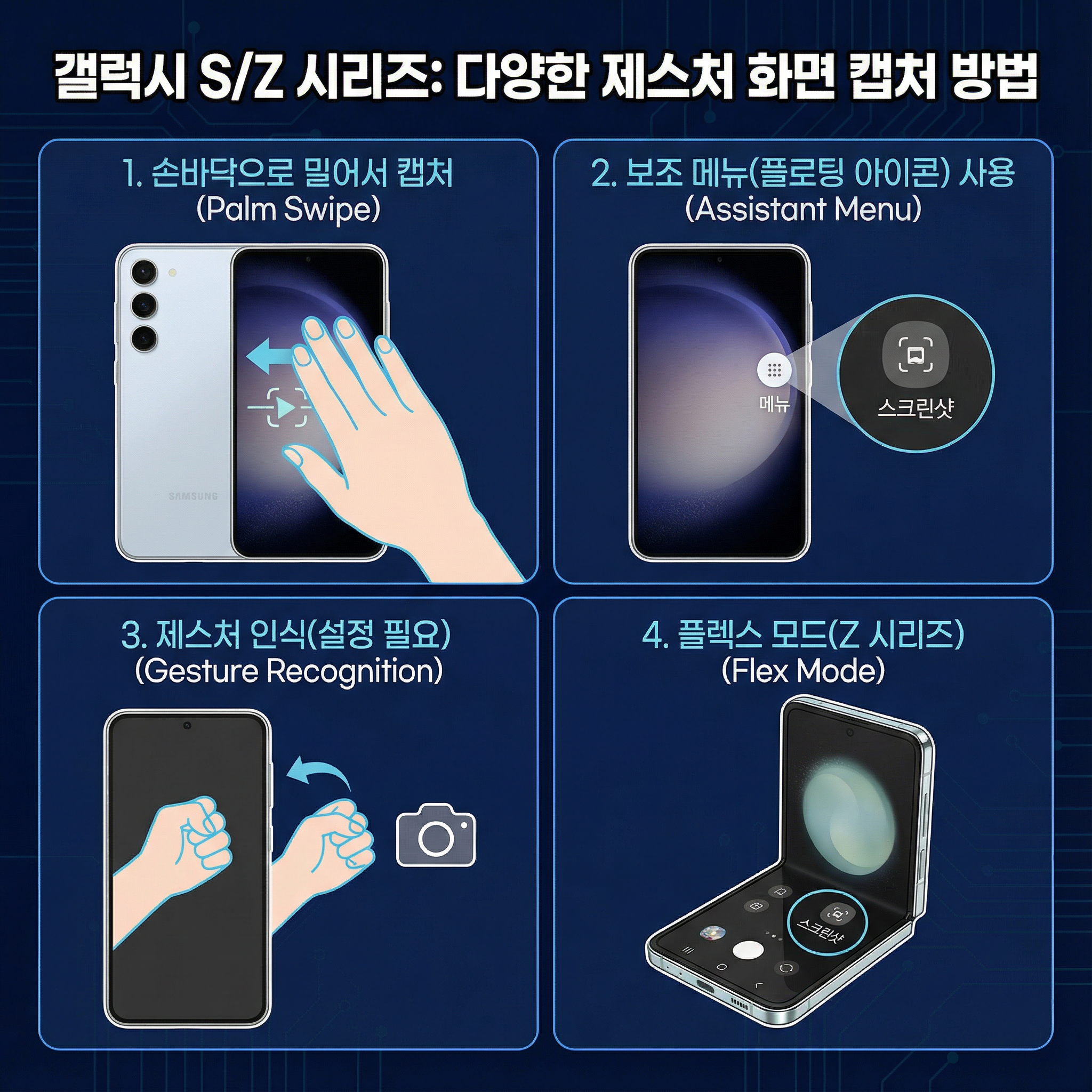 | 손날 스와이프 캡쳐 | 설정에서 ‘손날로 스와이프하여 캡처’ 켠 뒤, 손날로 화면 좌우 스와이프 | 갤럭시 S / Z / 노트 계열 대부분 |