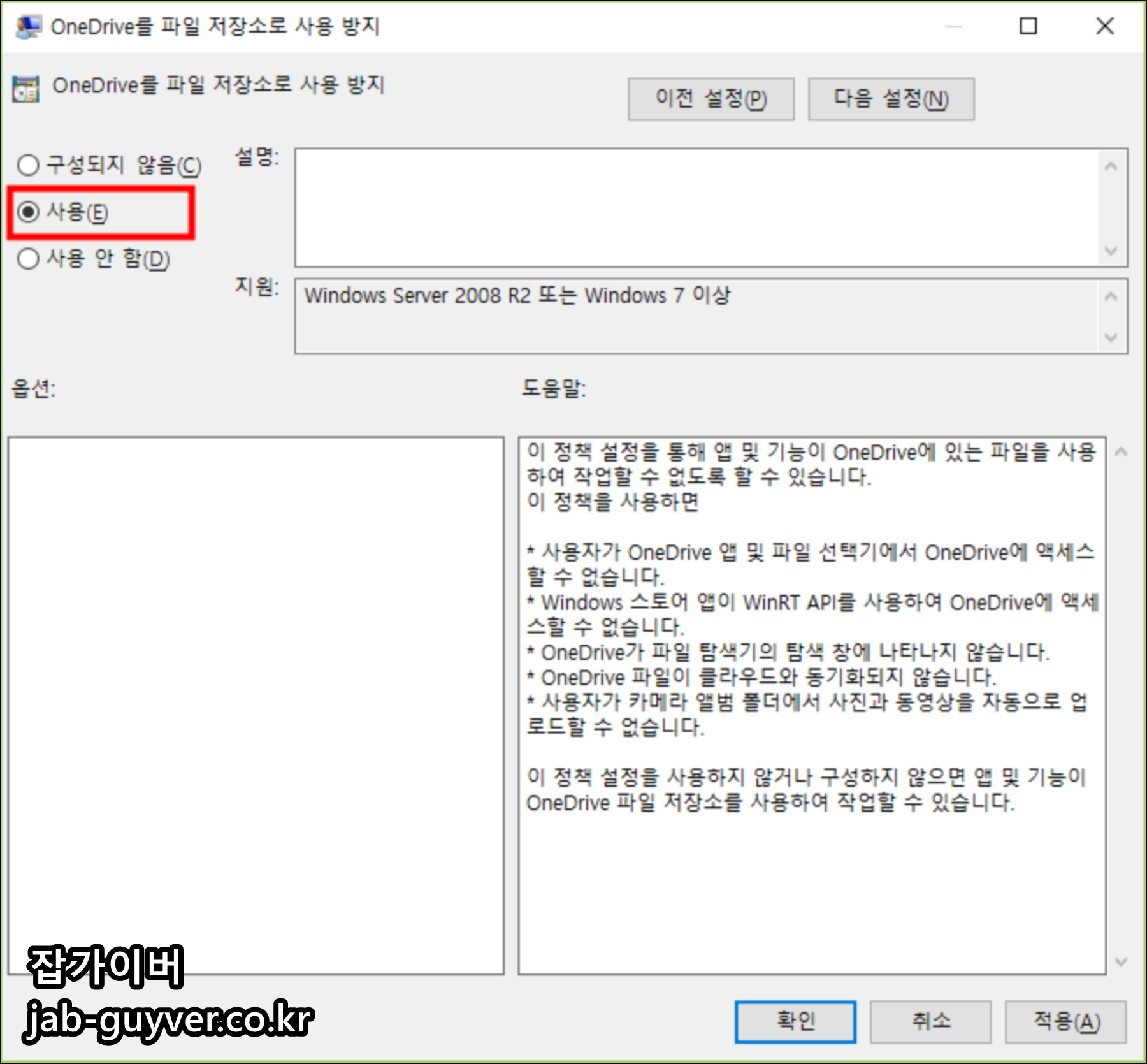 이 항목을 열어 사용으로 설정하면 OneDrive 연동이 대폭 제한됩니다.