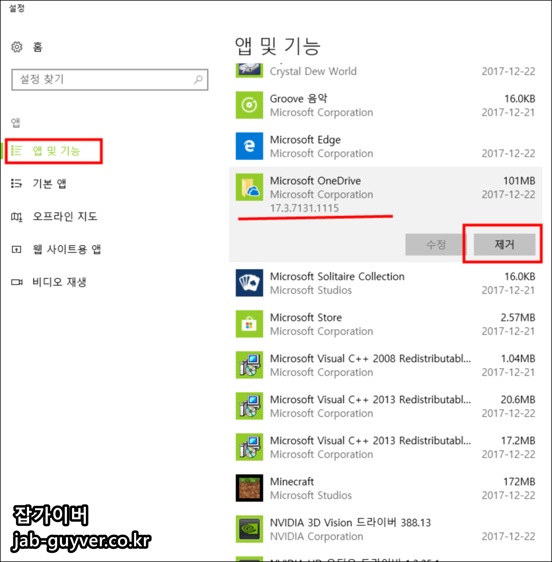 윈도우10·11에서는 설정 > 앱 > 설치된 앱에서 OneDrive를 찾아 제거할 수 있고, 예전 버전에서는 프로그램 추가/제거에서 Microsoft OneDrive를 선택한 뒤 제거를 눌러 삭제합니다.