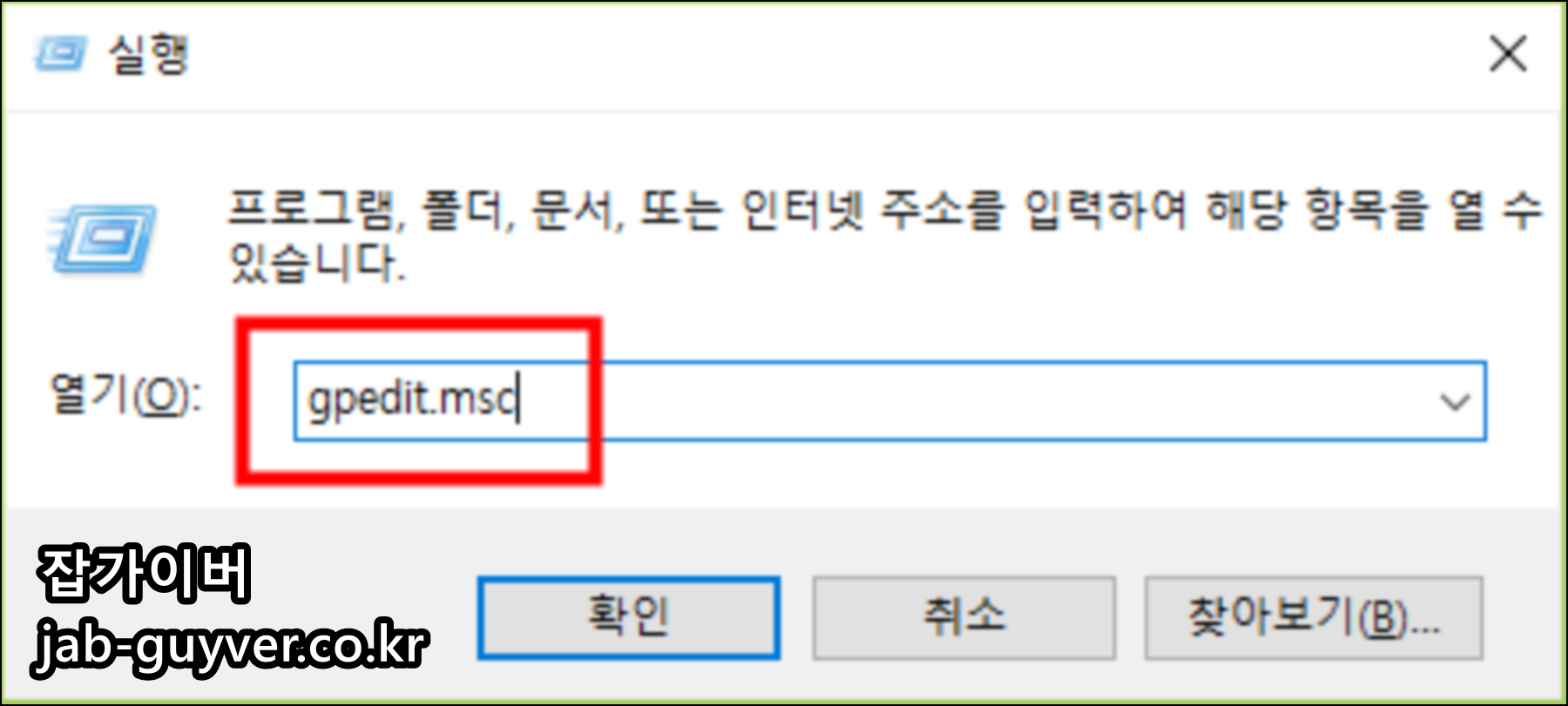 실행 창(Win + R)을 열고 gpedit.msc를 입력한 뒤 확인을 누르면 로컬 그룹 정책 편집기가 열립니다.