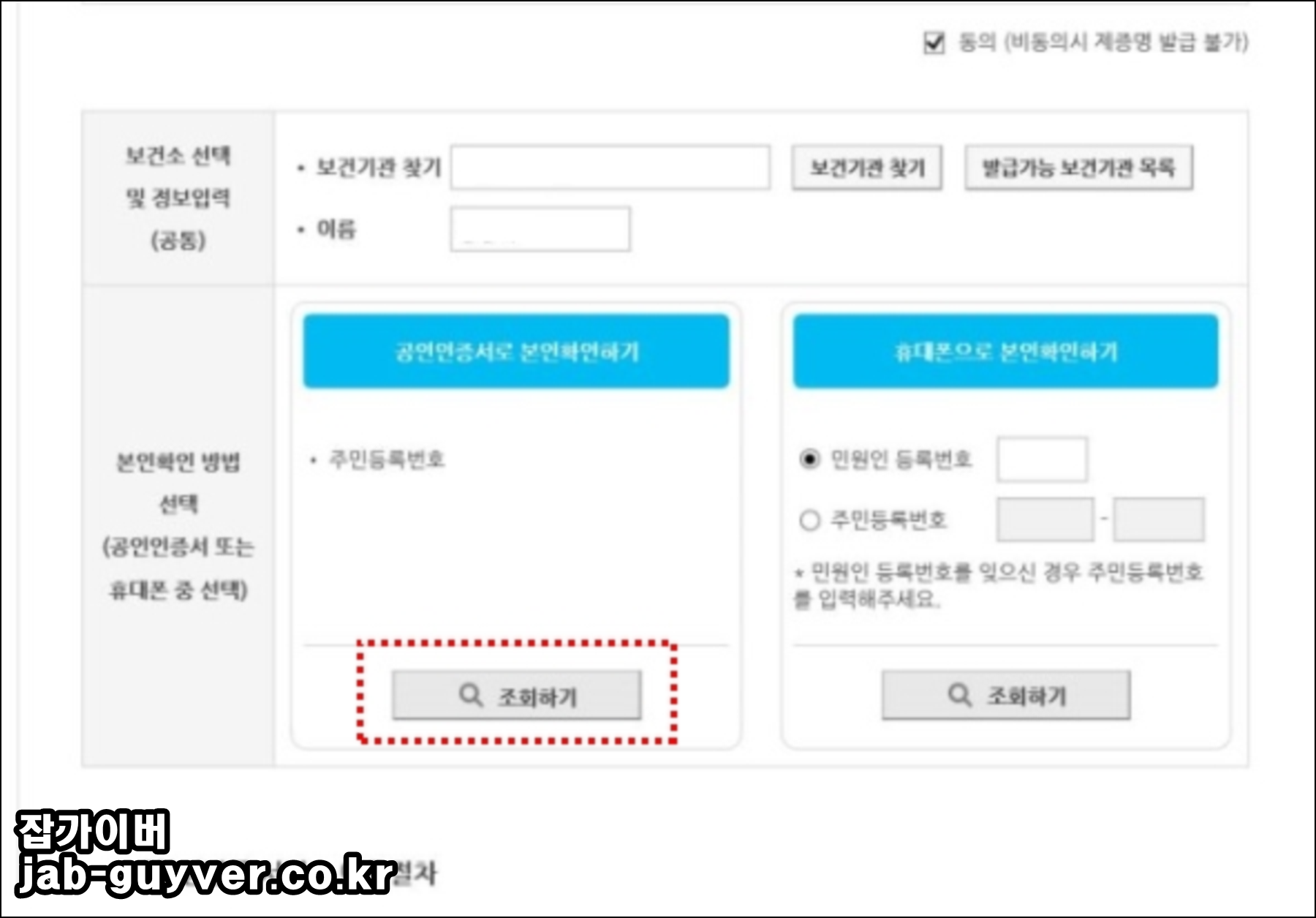 이후 공인인증서나 휴대전화를 통한 본인인증 조회를 합니다.