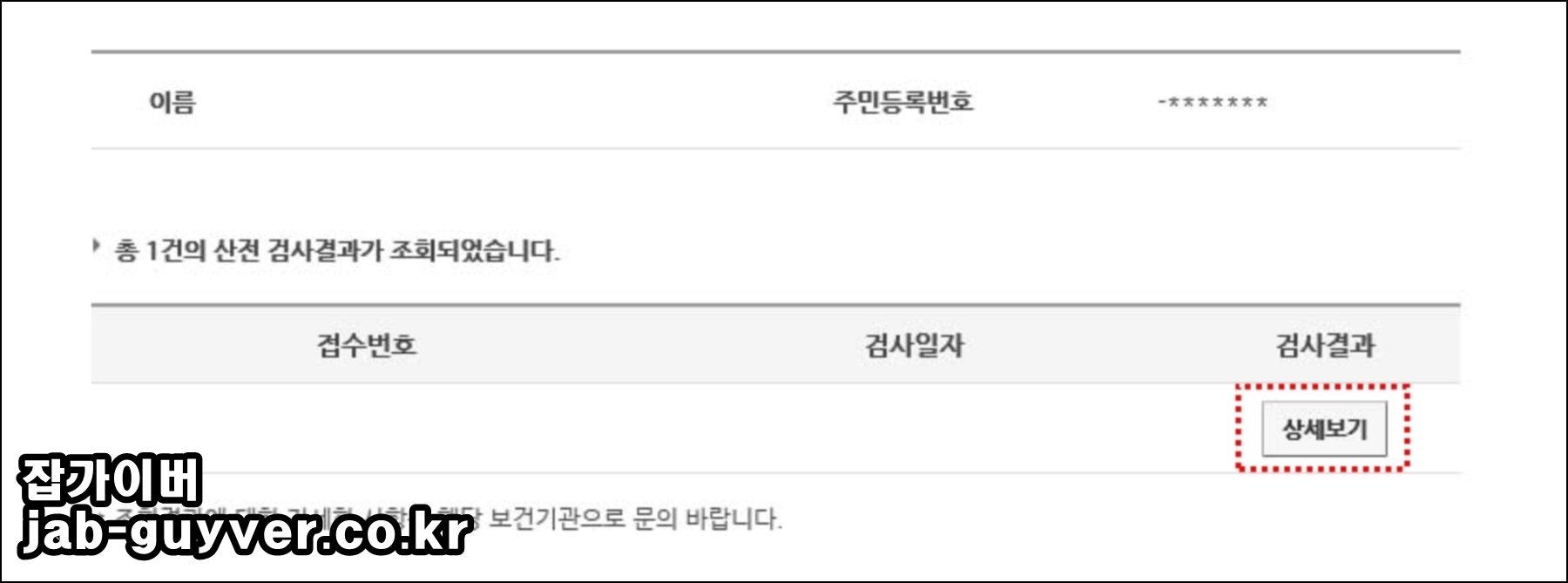 검사를 통해 해당 검사일자 및 접수번호를 확인할 수 있으며 상세보기를 클릭합니다.