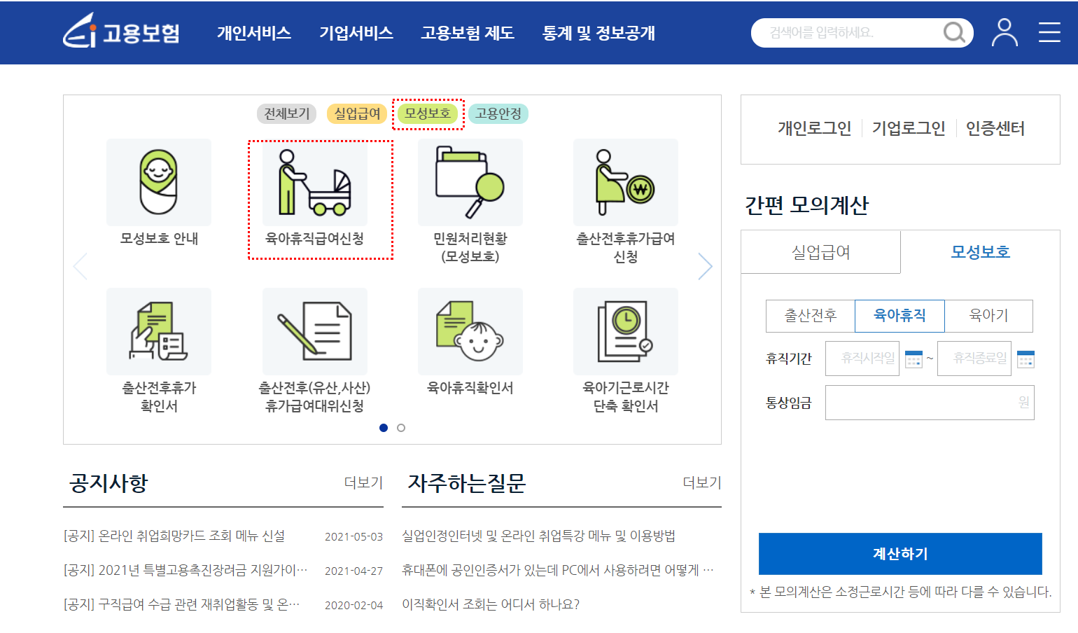 간편모의계산을 통해 모성보호탭에서 출산전후, 육아휴직,육아기에 대한 휴직기간에 다른 통상임금을 계산해볼 수 있습니다.