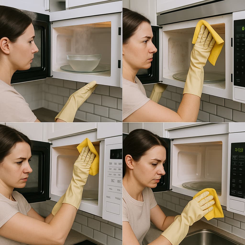 물과 식초를 섞어 물기 있는 천에 바르거나 분무기에 담아 뿌려 전자렌지 안쪽을 닦아줍니다.